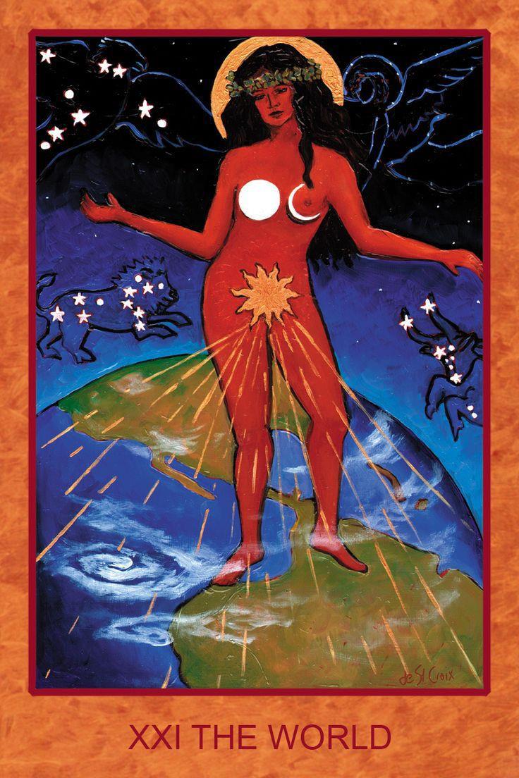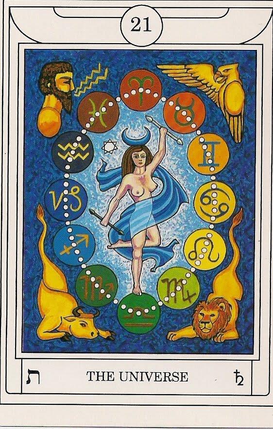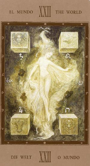 Технически же создать «пустоту» вот так как это сделал Ройо (его версия 21 аркана чуть выше, там где кубические символы тетраморфа) очень сложно для художников карт Таро. Да и для восприятия обычных покупательниц непросто. Так что небо, со звёздами, облачками и галактиками — теперь прочно прописались в этом аркане.