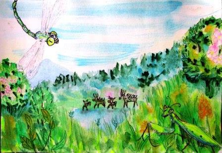 А теперь можно показать и свою работу. Мне выпало иллюстрировать роман А.Самойлова «Закат ванильной эры» https://author.today/work/62105 Роман довольно жёсткий и я никогда не рисовала в том стиле, что требуется для этого текста. К счастью, в самом начале идёт пейзажная зарисовка со стрекозами-убийцами, оленями-монстрами на водопое и я решила нарисовать именно это начало. Там даётся намёк, что природа внешне не столь зловеща. Опасность прячется. Вот я и решила нарисовать такую почти идиллию, сраотать на контрасте. Хотела вначале нарисовать оптический прицел, в который смотрит один из группы, но я слишком далека от этой техники и не рискнула, чтобы не допустить ляпа.