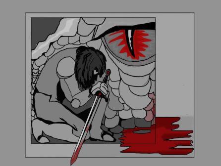 1. Конкурсная работа Маргариты Гуминенко. Это самые первые страницы рассказа, где Чёрный Фудок убивает дракона. Мне нравится строгость, минимализм этой иллюстрации. Она сразу настраивает на трагическую историю, которая начинается с этой победы.