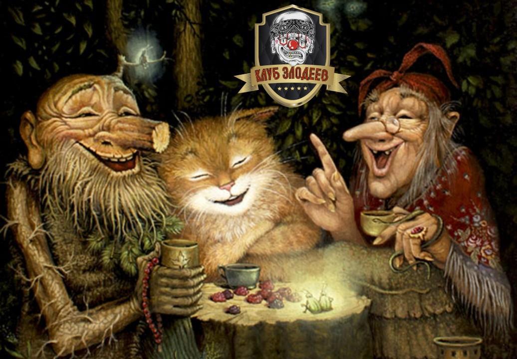 БАБА-ЯГА: Так оно под запретом у нечисти, вот и не можешь его вымолвить. Мы же поэтому у тебя в бане и собираемся, тут икон нет, чуфырь-чуфырь. А так бы к домовому пошли.