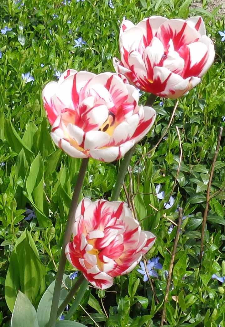 Пёстрые тюльпаны растут прямо среди барвинка.