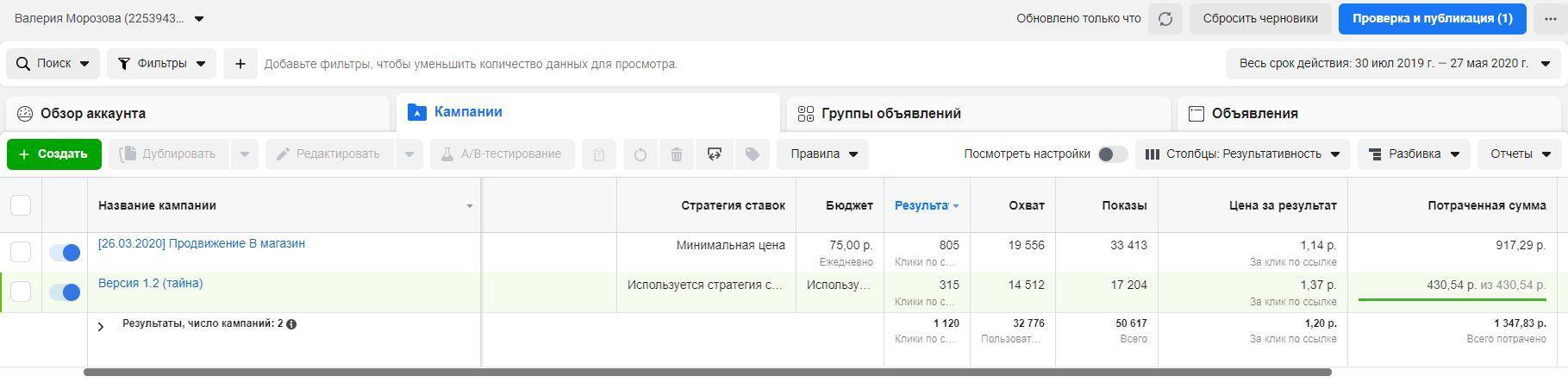 К исходу первой недели, объявление стало крутиться хуже. Почему-то показы не шли. Деньги не тратились. Я не рекламщик. Вообще не понимаю почему так произошло. Поэтому я просто продублировала объявление. Немного его подправила (как раз возраст аудитории сузила). К концу положенного срока у меня крутилось два объявления. Вот результат того рекламного периода на АТ. Оцените