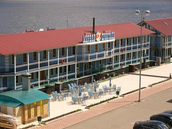 Отель приятно удивил, он и правда на воде, на реке Волга и правда ночью когда спишь чувствуешь легкое покачивание, на самом деле очень необычно, особенно для тех, кто не был в круизах. Завтраки (в отеле входят в стоимость) по настоящему советские, прям запеканочка со сгущенкой и компот. в отеле есть номера (мансардные) очень современные, прям как в отелях 5* (причем номера с двумя спальнями и залом). В отеле так же есть баня, вполне такая нормальная банька.