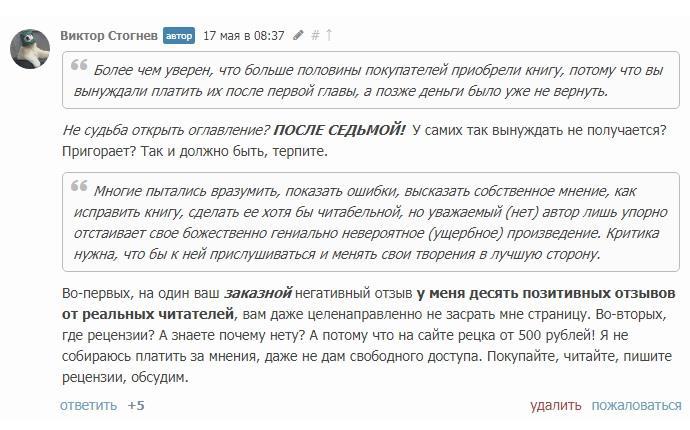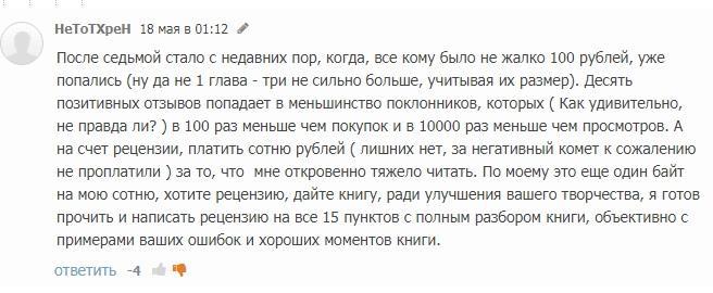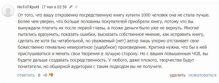 В первом отзыве он наградил меня и книгу смачными эпитетами, во втором признаётся, что книгу не читал - денег нет - и просит промо, дабы книгу прочитать и разобрать для улучшения моего творчества, о котором он не может иметь понятия.