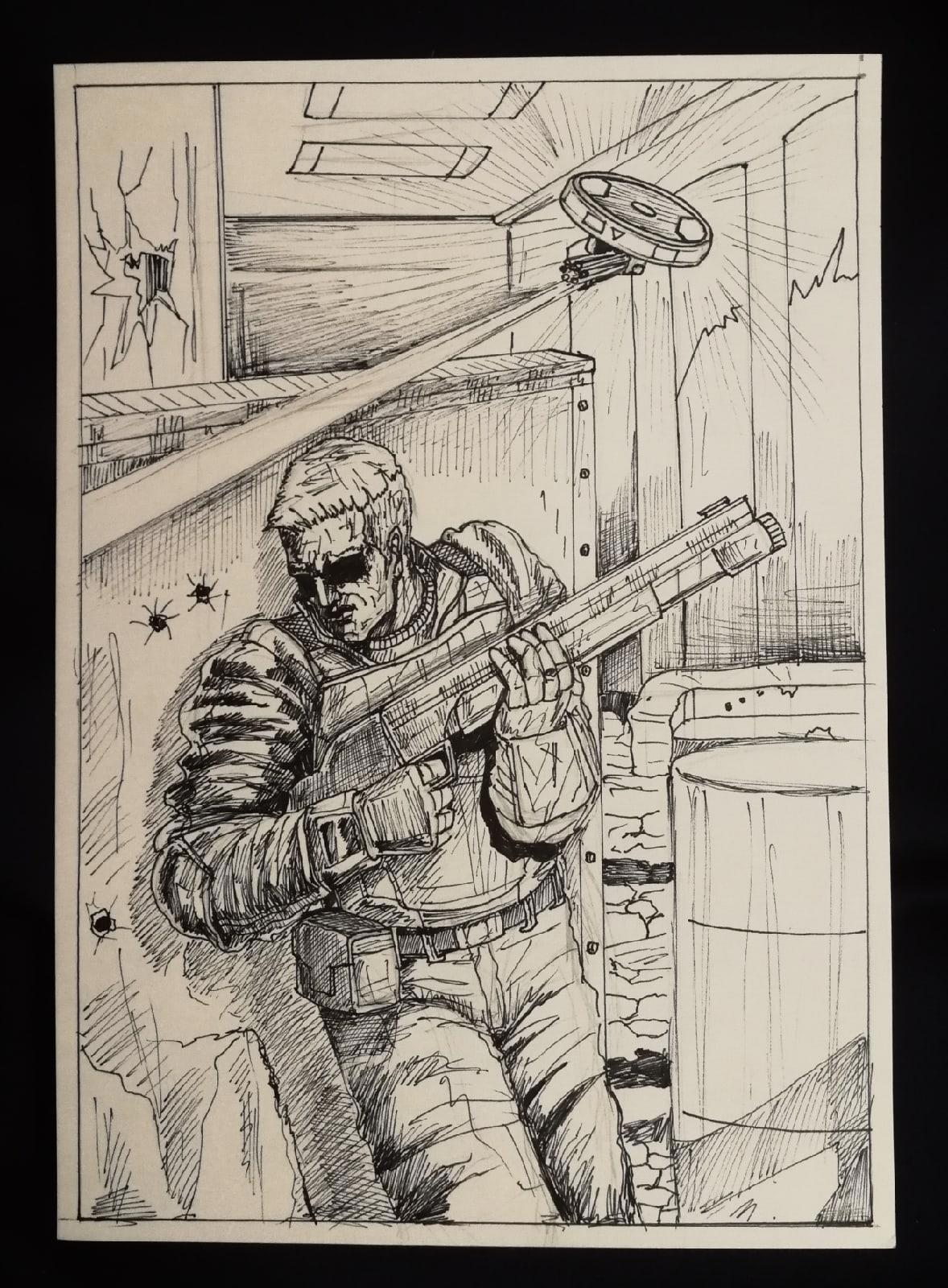 Это иллюстрация к первой Свалке https://author.today/work/35097 стычка новичка еще даже не получившего имени и таблетки. Таблетка вышла несколько более крутой чем была на самом деле турелька с одним стволом а тут целый миниган, да и герой одет куда лучше, но все равно по мне это офигенно классная работа. Я большой любитель графики, и всегда завидовал книгам Круза в которых эта графика была. И вот теперь у меня тоже есть. Виктор спасибо огромное это был очень приятный подарок.