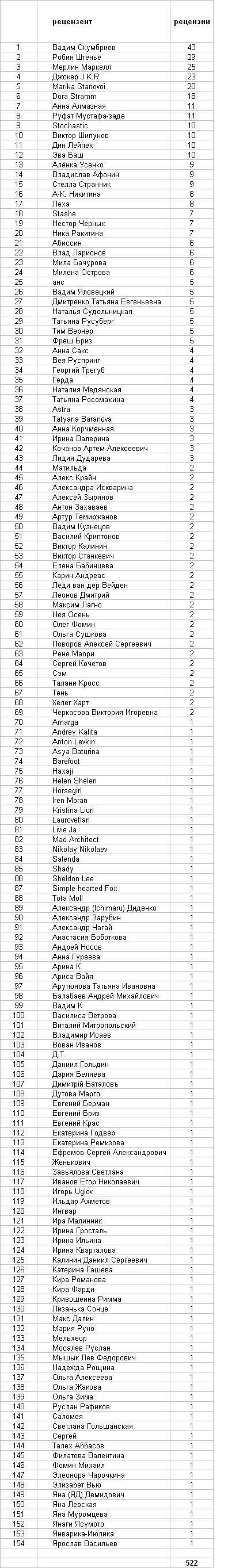 Итак, на данный момент в рамках конкурса "Фантастический прорыв" 154 рецензентами написано 522 рецензии. То есть, в среднем на одного рецензента приходится 3,38 рецензий. При этом, что интересно, из 154 рецензентов 85 (более половины) написали только одну рецензию... Продолжение следует