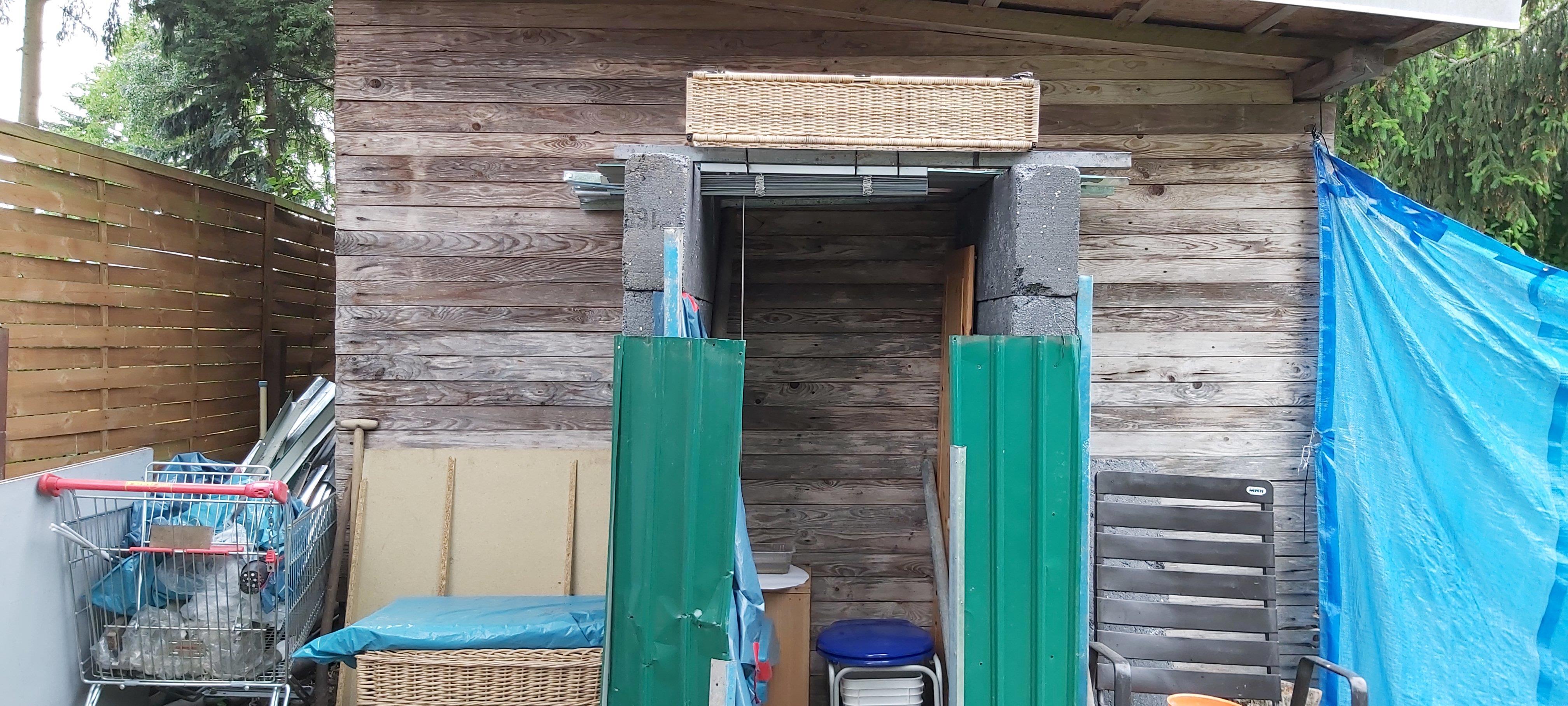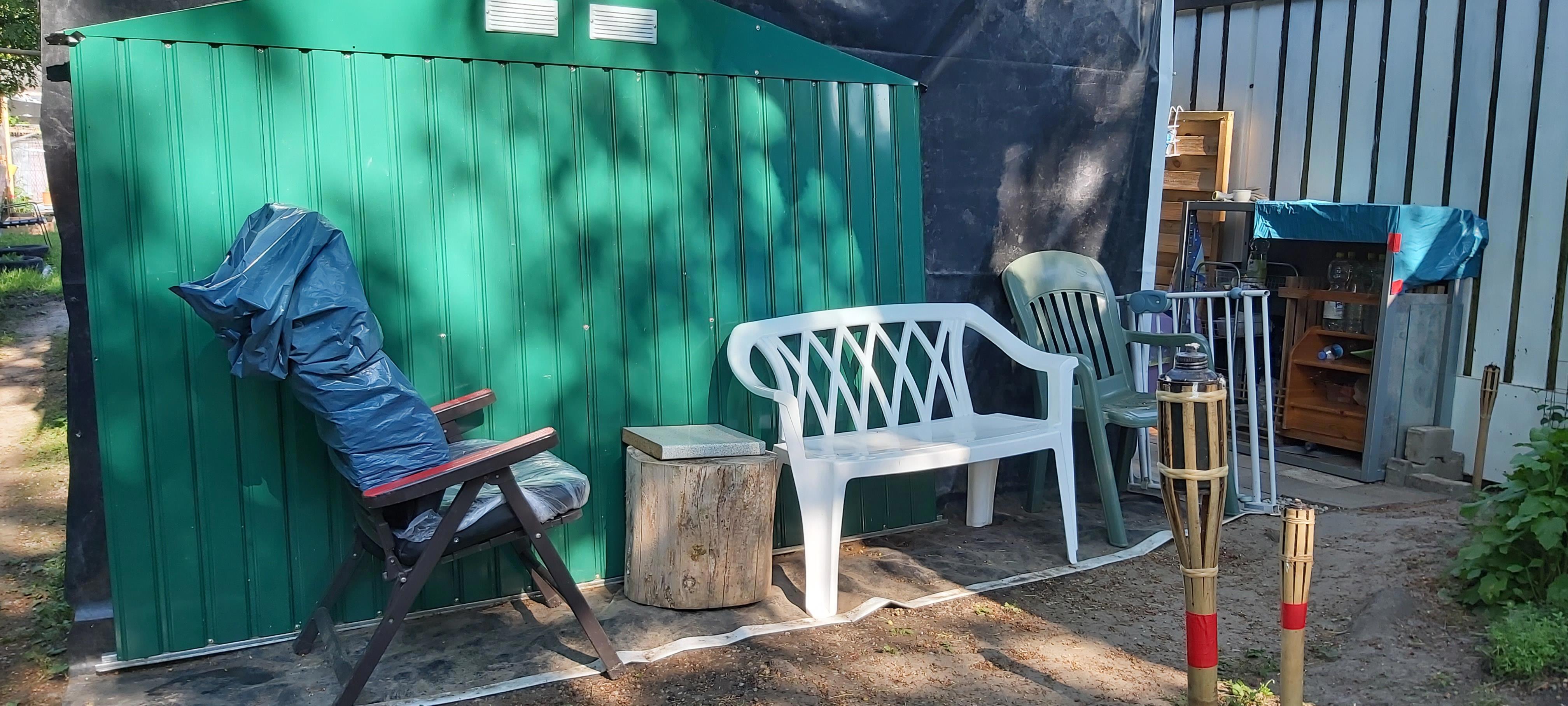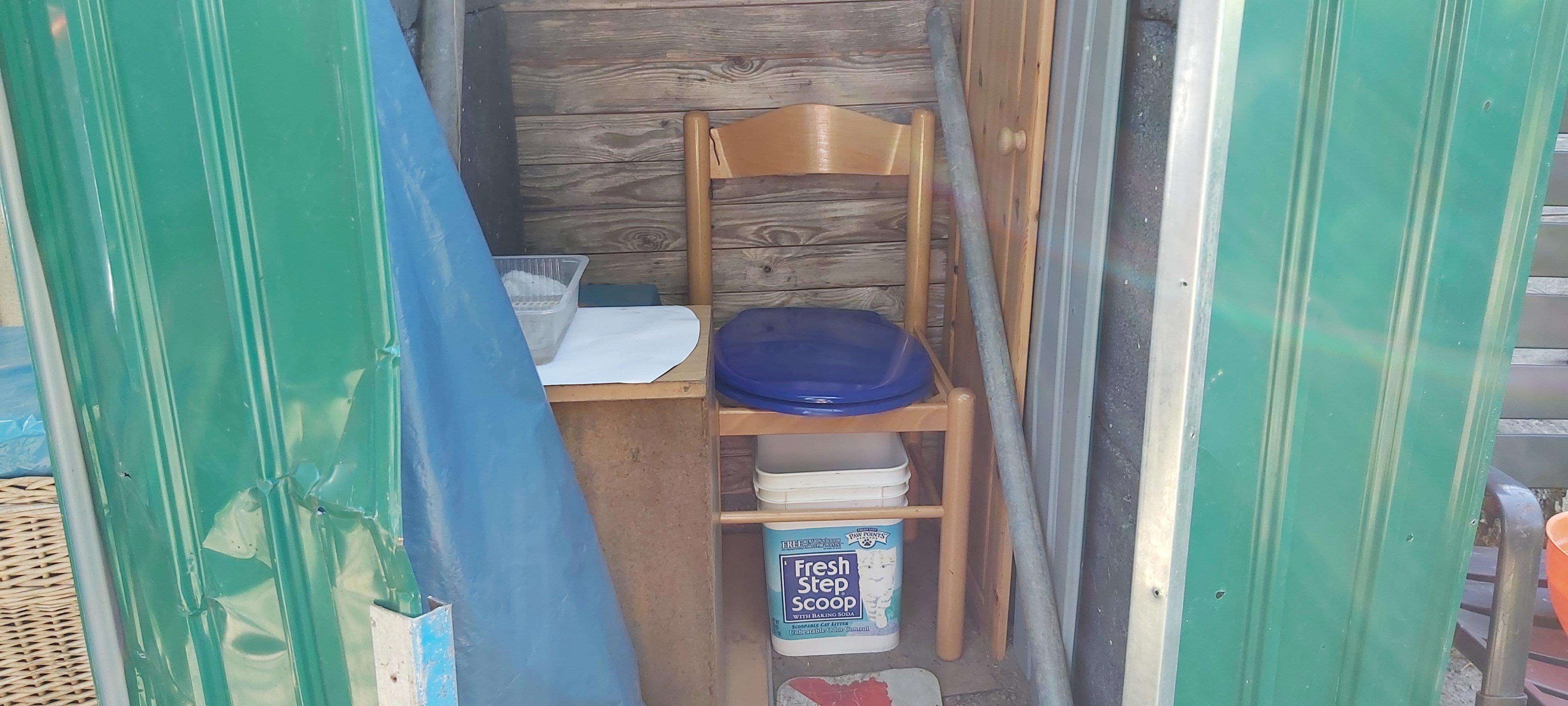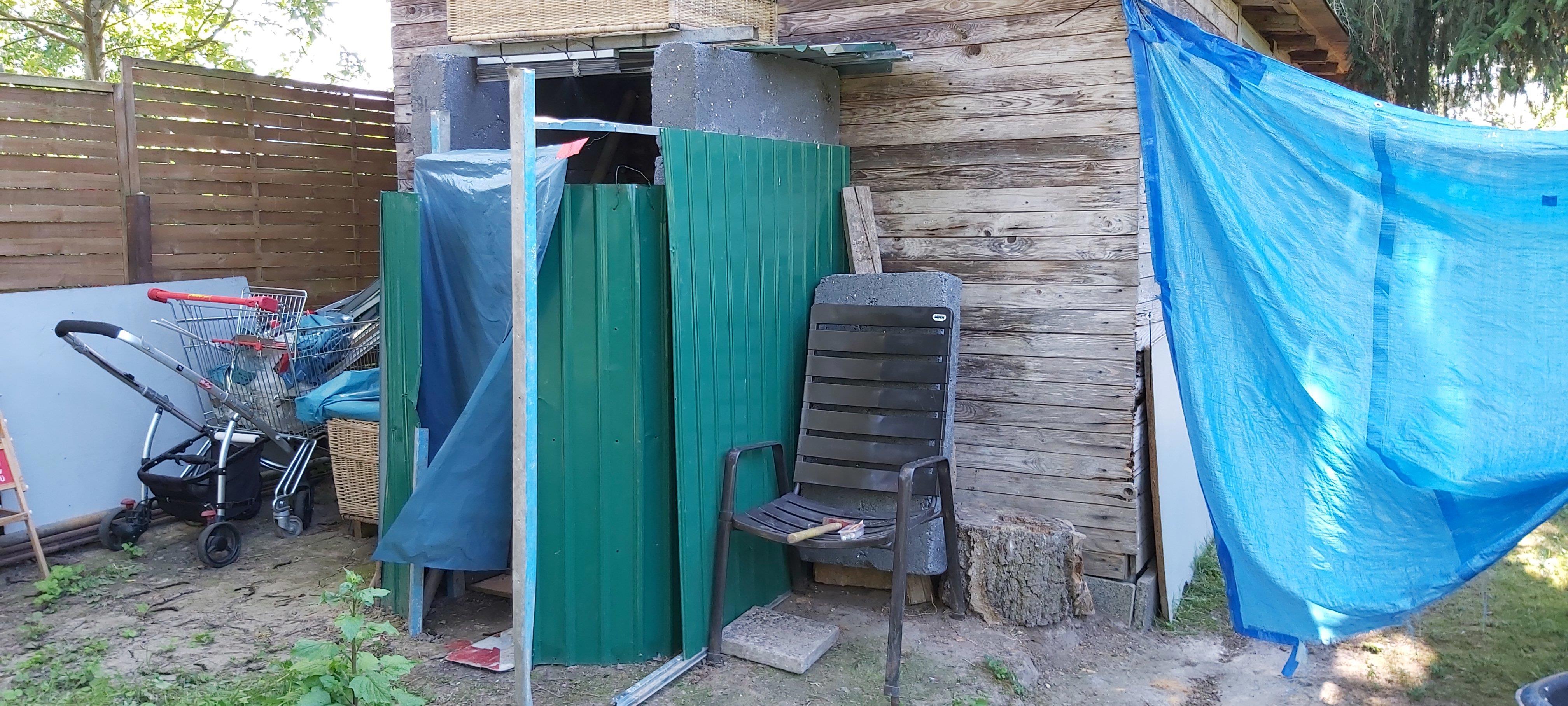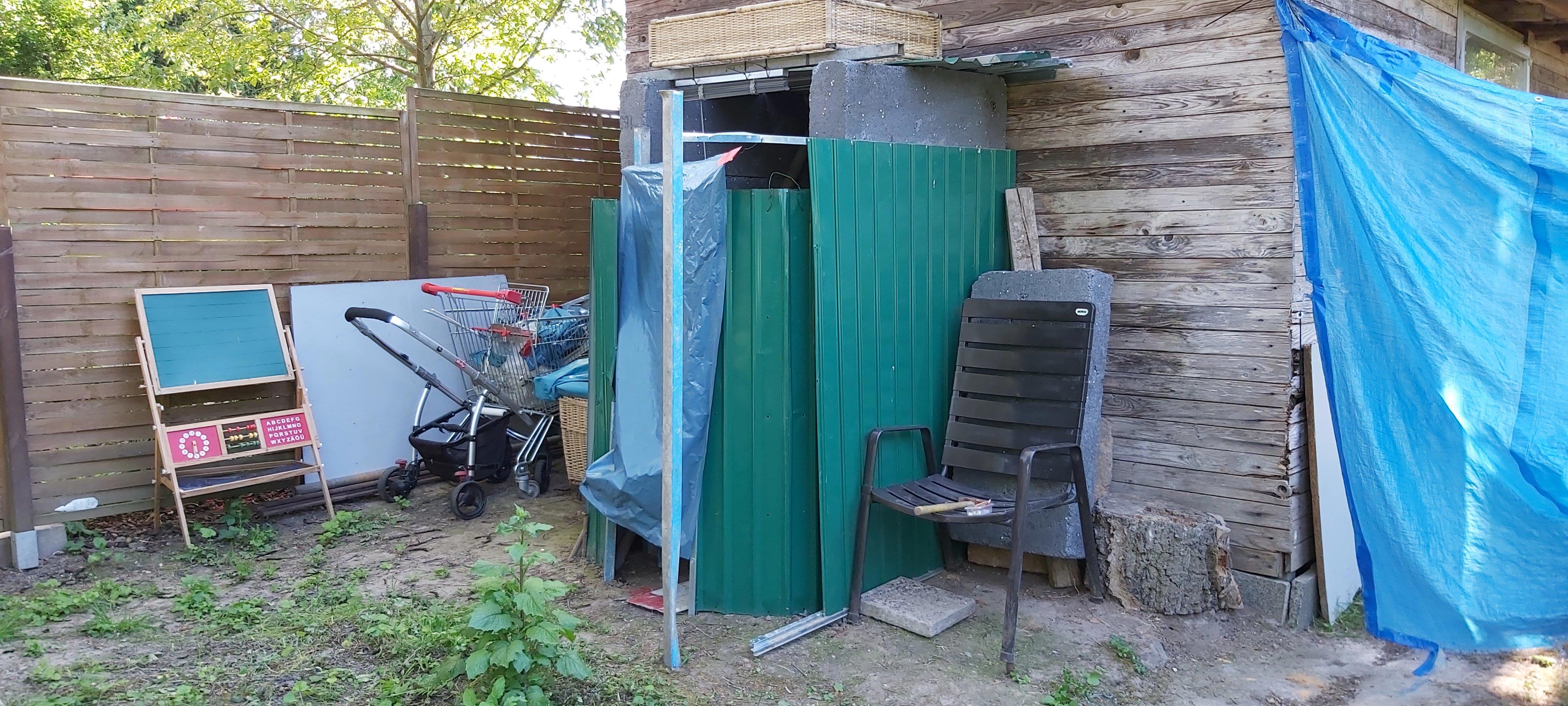 Сначала стульчак из дома приволокла...![]() | ...А потом стул попалси подходящий, и вуаля.![]() | Стенку зелёненькую справа поставила, обшиваю, уплотняю, хы. ![]() |
