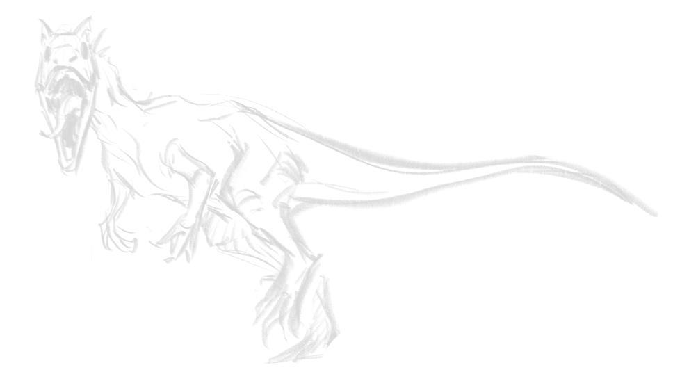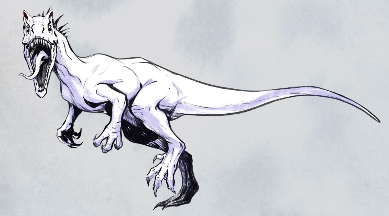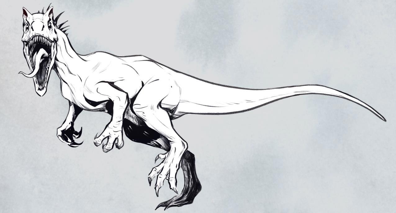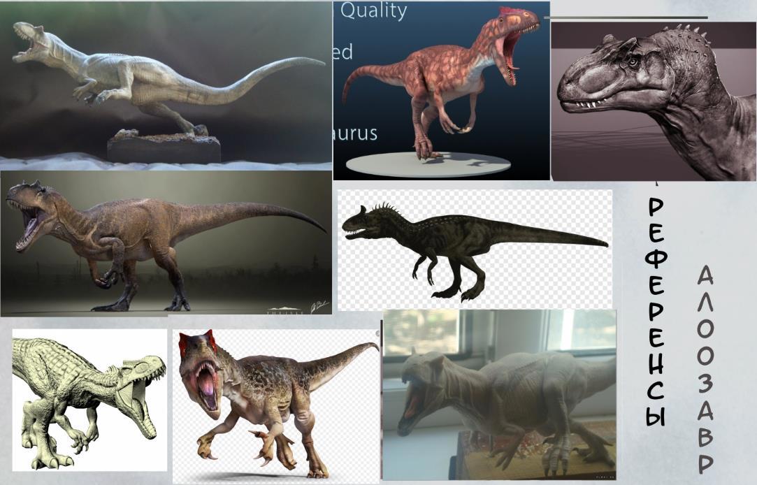 Сперва нашла реконструкции и разные изображения аллозавра и сделала скетч. Собиралась сделать его веселым и опасным, но не сильно стилизованным, поэтому была выбрана такая поза: