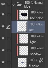 Затем рисую слой с тенью на объекте в режиме умножения. И приходит время нарисовать веселый окрас. В данном случае это синий.