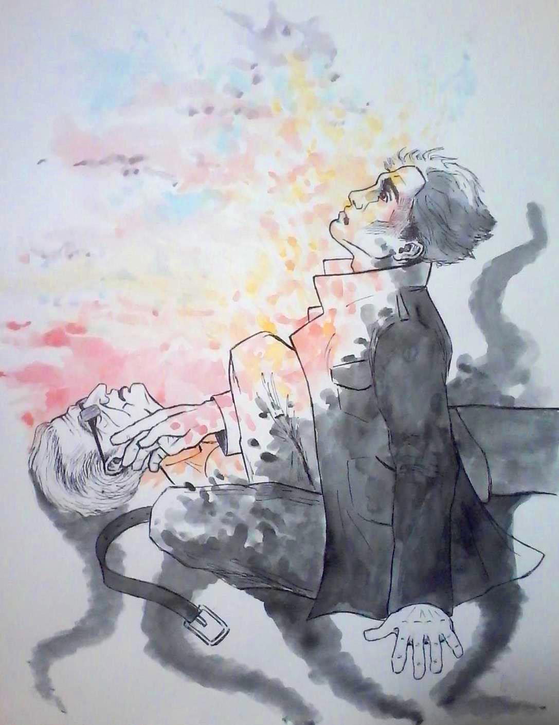 Пожалуй, это один из самых драматичных и самых важных для меня моментов сюжета. Думаю, у всех авторов бывает сцена, которая появляется в воображении раньше других, видится ярче всего, и все дороги ведут героя именно к этой сцене. Вот и мой Джон появился на свет, чтобы в итоге встретиться с антагонистом один на один. Неле просто идеально воплотила образы героев и передала напряжение эпизода. Здесь прекрасно всё – лица, пластика, детали (даже куртка у Джона в точности такая, какая описана в тексте, и видно, что ветер дует герою в лицо). А цвет и светотень словно бы рассказывают историю заново.