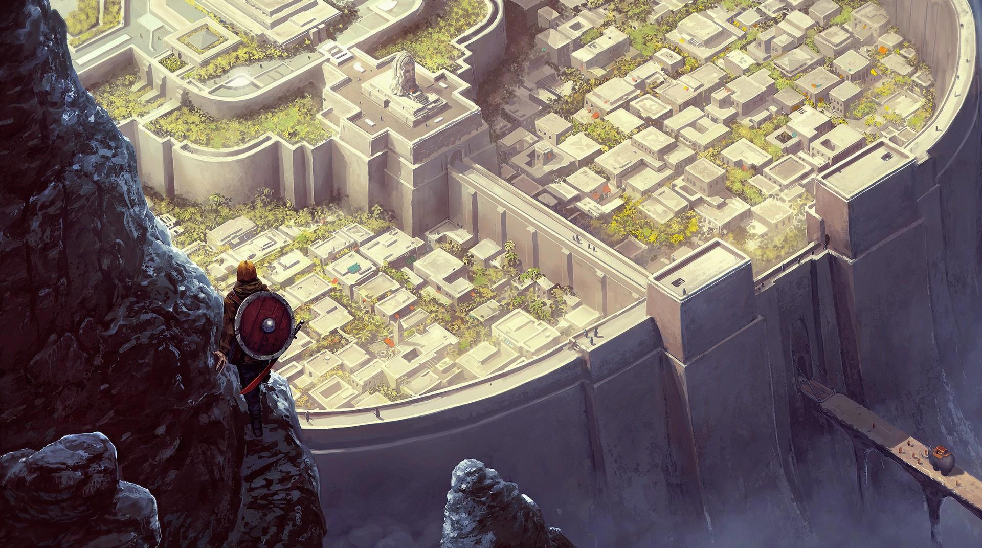 Под ним, распростёрся большой город, в который, по мосту, заезжает величественная особа на слоне и прислугой в золотистых одеяниях. Стены города уходят глубоко внизу и скрыты туманом. Стража стоит по всему периметру, на высоких стенах и у входа в город, как и у замка. Каменный мост, держится на природных основаниях, которые также скрываются в тумане. Город разделён на три части, если две из них только стеной, то оставшаяся делит простой люд от высшего сословия. Пройдя через мост, можно попасть на стену, которая и делит две части города. Дорога на стене ведёт выше, к статуе, от которой можно попасть в замок. Можно выделить, что этот город весь бел и зелен, что говорит о процветании.