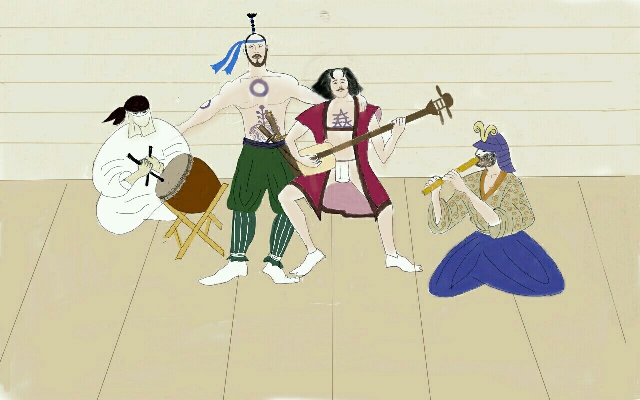 По мотивам рецензии на роман Ната Фламмера https://author.today/work/5134 Справа налево: Фукусима Масанори (непонятно, зачем затесался с фуэ), параноик Мицунари с сямисэном, серийный убийца Киемаса умеет только петь и сам андеграунд Отани Ёсицугу с тайко (это еще и барабан). А вообще, это правитель в отставке