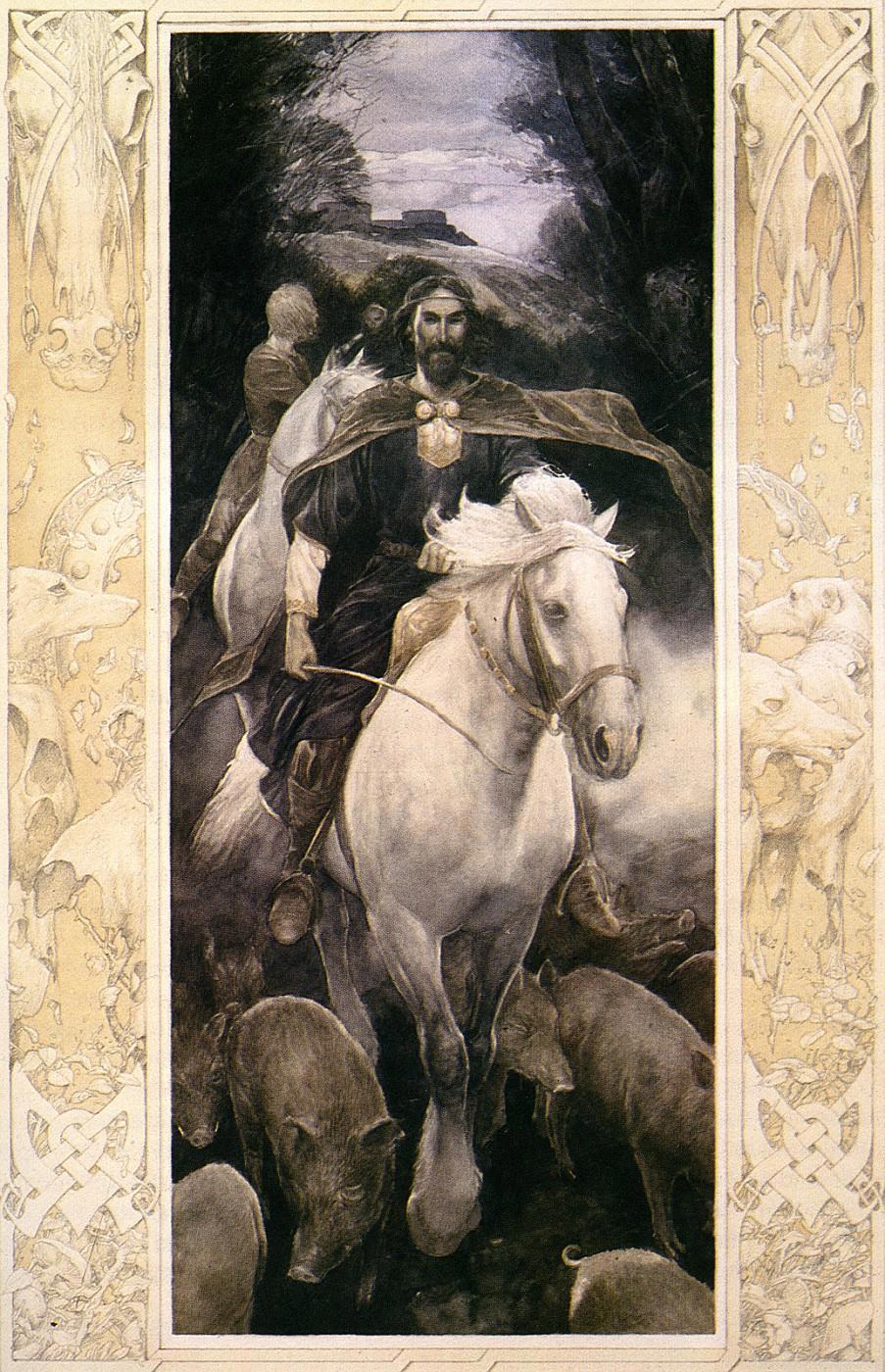 А для того отправился он с миссией в южное валлийское королевство Дивед, пообещав своему королю и дяде Мату, что привезет оттуда чудесных животных, принадлежащих королю Придери, которых тот, в свою очередь, получил в дар от самого короля потустороннего мира, владыки Арауна. Необыкновенные животные, хранимые королем как самое дорогое сокровище, звались свиньями. Понятное дело, такая диковинка не могла не заинтересовать Мата ап Матонви, и он поручил племяннику выторговать у южан хоть несколько свиней.