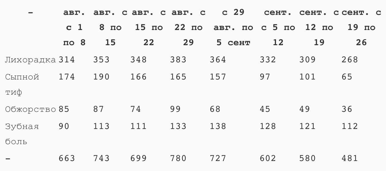 Так вот, сомнений не было, что большая часть указанных здесь людей умерла от чумы, но чиновников уговорили записать их умершими от других болезней, при этом количество умерших по конкретным названиям распределялось следующим образом:
