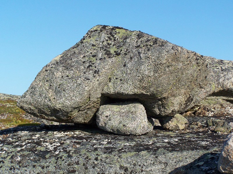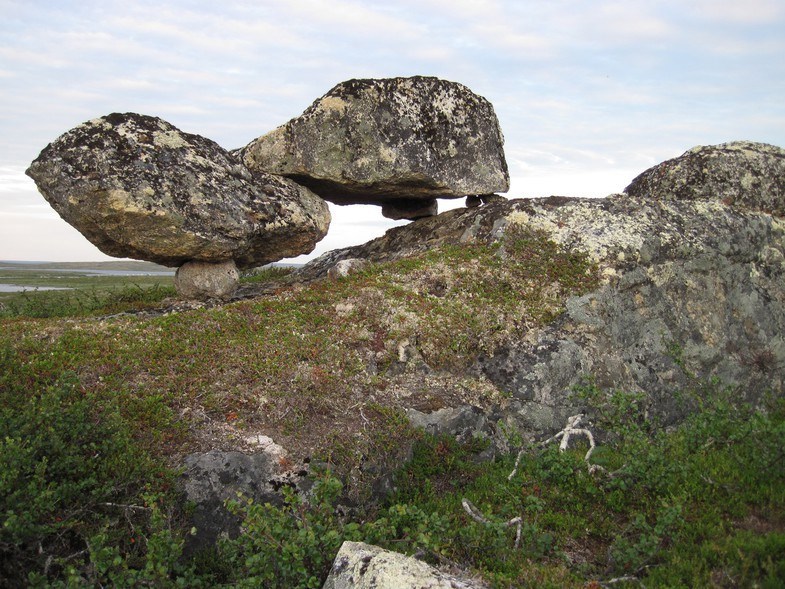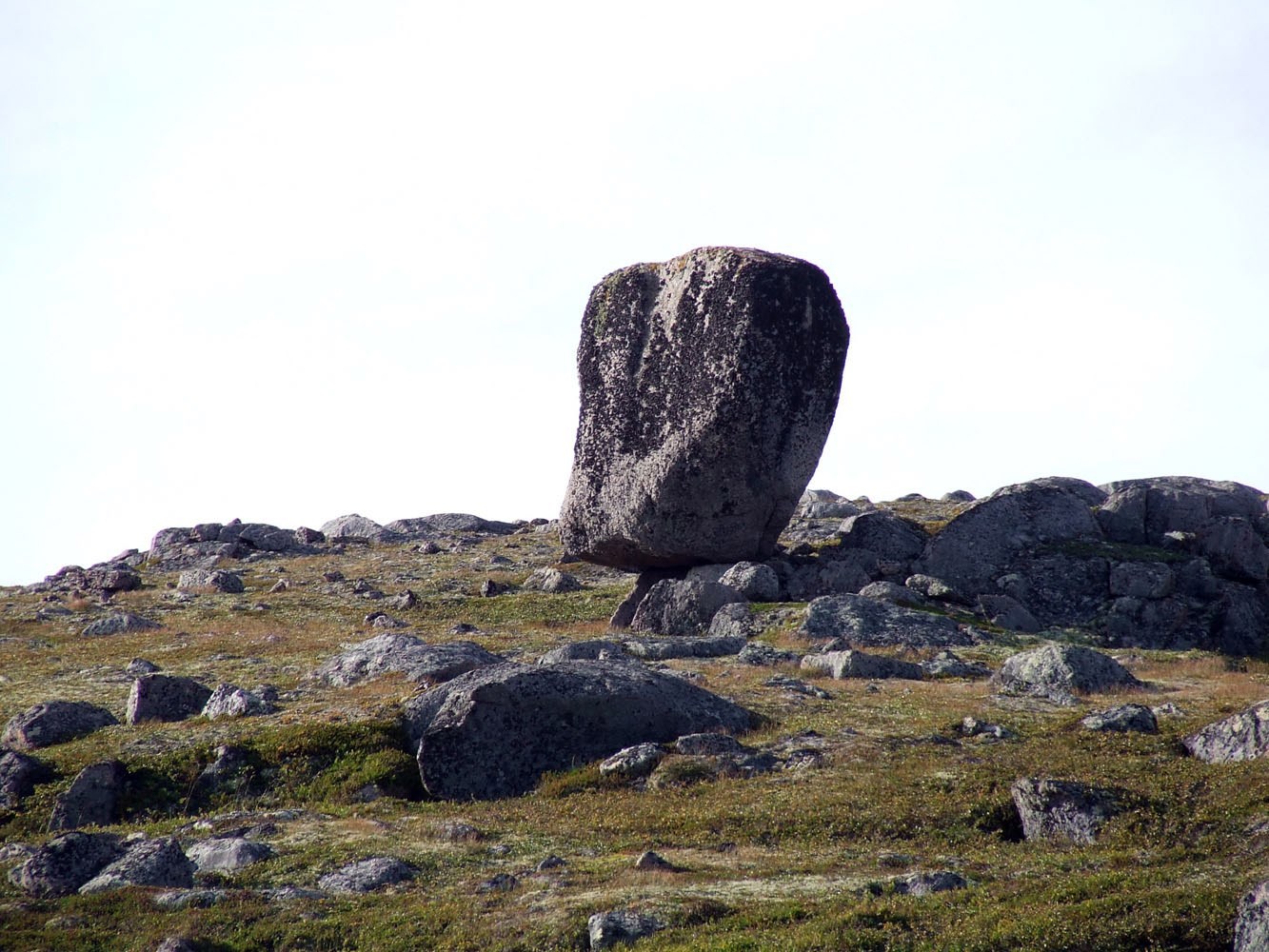 Итак. «Классика» сейда – здоровенный валун, весом в десятки тонн иногда, стоящий на маленьких камешках и наверху ещё один – «шапочка» (так их чаще всего называют). Однако на самом деле сейды куда разнообразнее. Они бывают округлыми, угловатыми, плоскими, зооморфными. Они могут лежать горизонтально, под углом и стоять вертикально. Количество опорных камней может быть два, три и больше. Есть и такие, которые установлены на целом постаменте из других огромных камней. Самое интересное, что опорных камней может не быть совсем, да и сам камень может быть установлен не жёстко – они качаются … тысячелетиями! И не падают. Дело осложняется тем, что сейды отнюдь не одиноки – их соседями являются каменные лабиринты, каменные «троны», другие явно искусственные сооружения из камней. Но оставлю их пока, чтобы не запутаться окончательно.