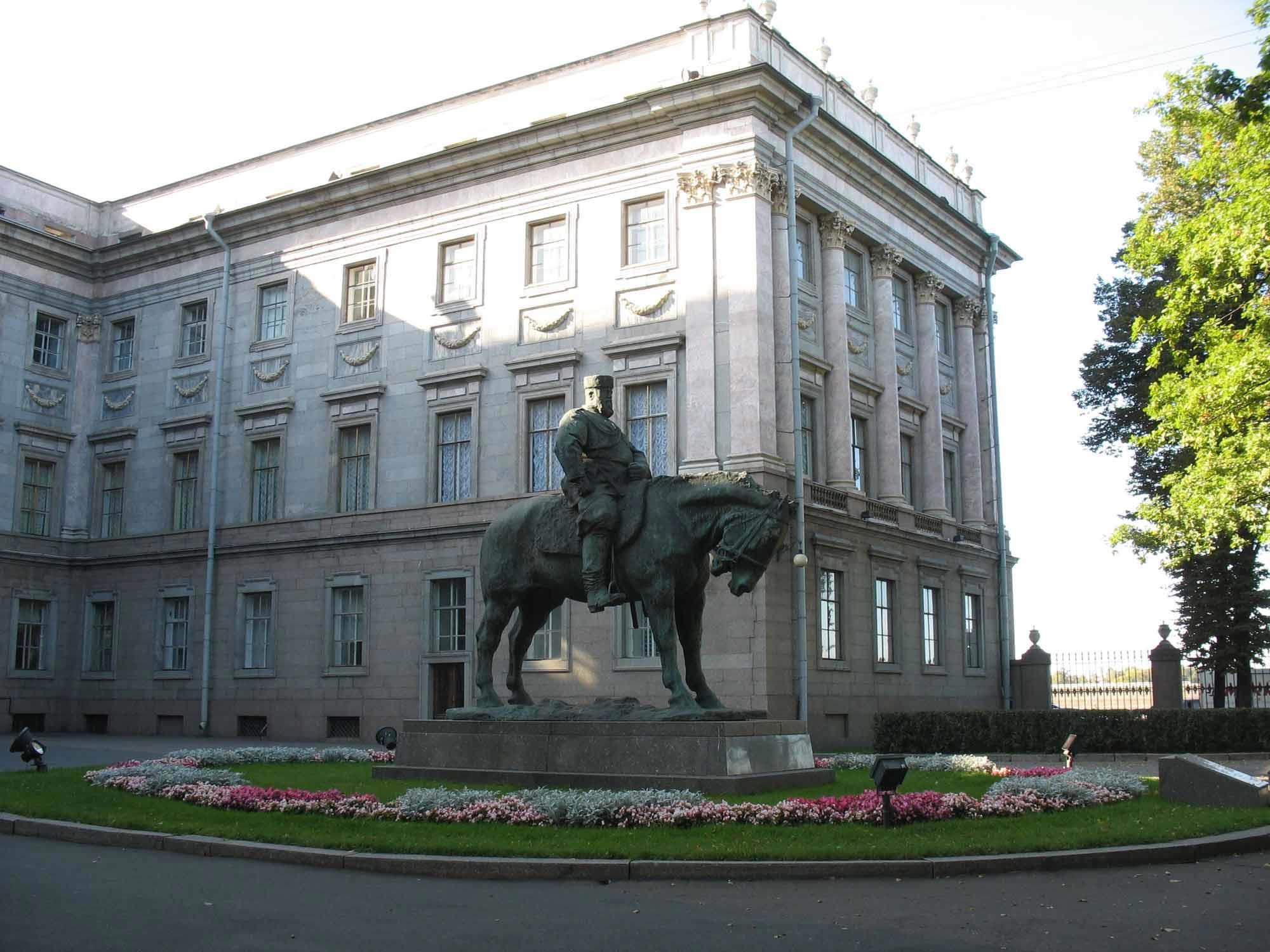 Мраморный дворец и статуя Александра III, перед которой на лавочке сидели персонажи.