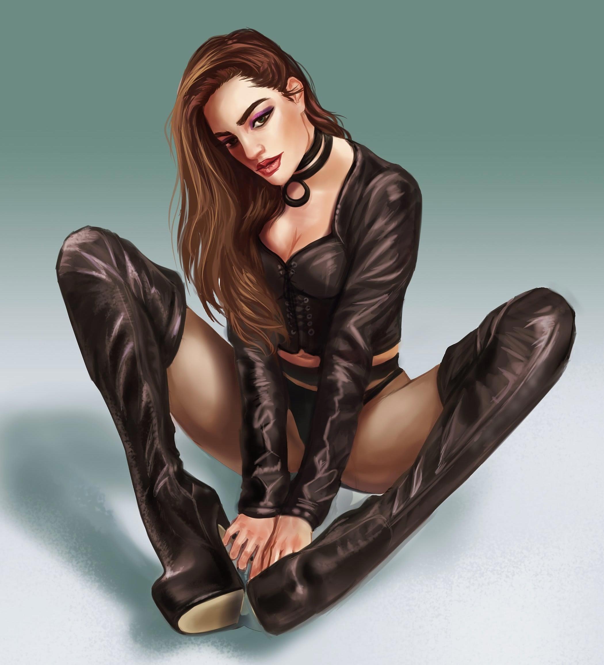 Решила рисовать регулярно подобных томных девиц. Тренировка на анатомию и блестящие текстуры. Ну, и на самом деле я большой фанат кожаной одежды и красивых сапог :D
