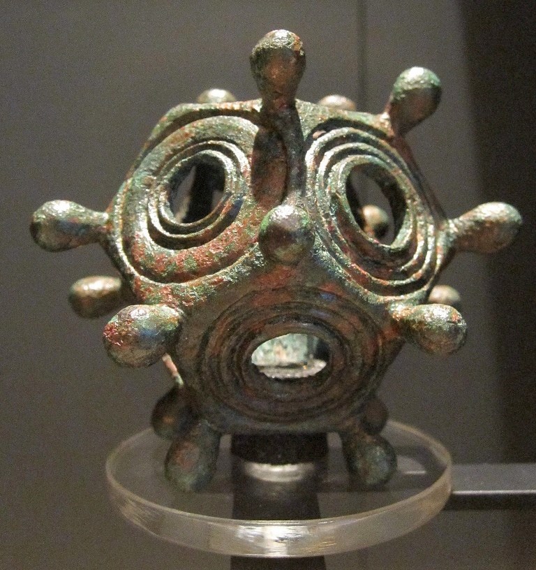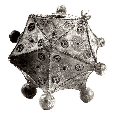 Были такие ребята – пифагорейцы. Были они примерно в районе Древней Греции, ну слышали, наверное. Так вот думали они, думали и пришли к выводу, что мир состоит всего из нескольких основных элементов – огонь, вода, земля, воздух и… эфир. Причём каждый из этих элементов в их остроумной гипотезе символизировала какая-то объёмная фигура – тетраэдр, октаэдр, икосаэдр, куб. Последний элемент – эфир символизировал додекаэдр, то есть двенадцатигранник. А Платон (или Сократ?) говаривал ещё, что мол земля похожа на шар, сшитый из двенадцати кусков кожи. А мячи для футбола тоже одно время шили… впрочем, это я так, к слову. Так вот этот самый двенадцатигранник пифагорейцы всерьёз считали священной фигурой. Может из-за того, что знаков зодиака тоже двенадцать. В общем число двенадцать встречается сплошь и рядом, где ни попадя, куда не ткнись, где надо и где … ну и тд. А ещё двенадцатигранники, сделанные из бронзы и не из бронзы находят археологи. А в каждой грани по дырочке, а на каждом углу по пупырышку. Вот такая СТРАННАЯ ШТУЧКА.