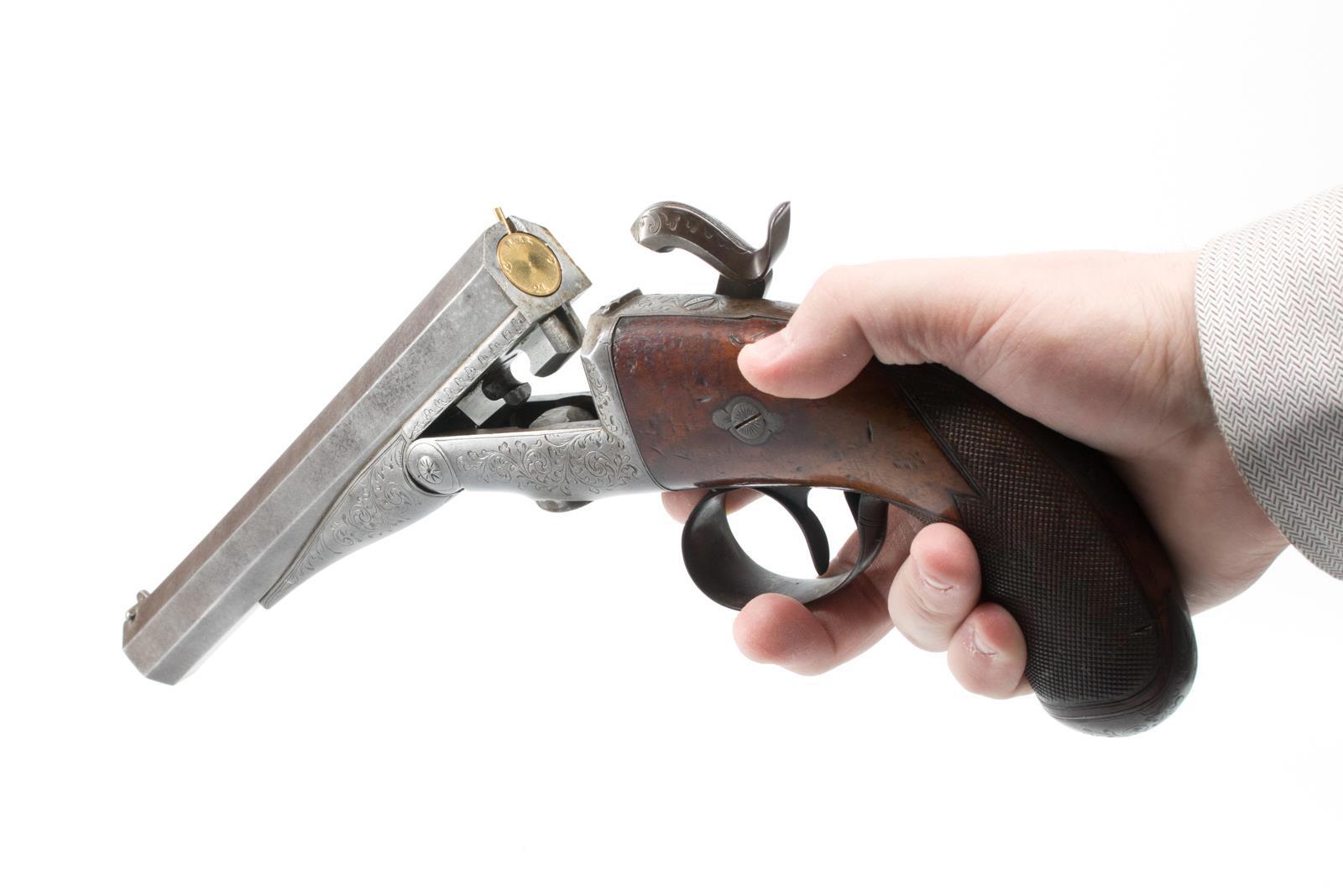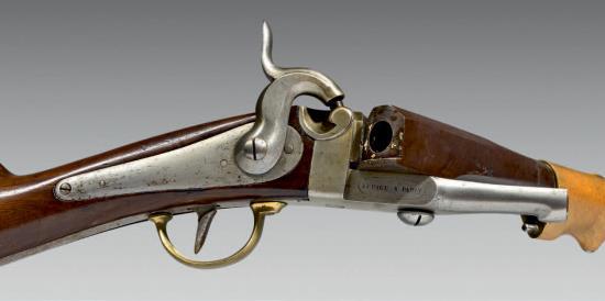 Один из примеров капсюльного оружия, нарезной дуэльный пистолет Перн-Лепаж с поворотным стволом.