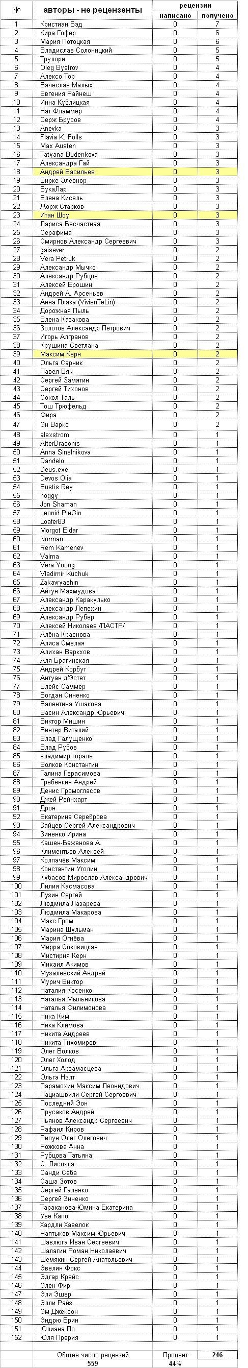 P.S. Жёлтым цветом выделены авторы, снявшие свои произведения с конкурса. Приходится их учитывать, потому что на их книги написаны рецензии, которые сохранились в базе.