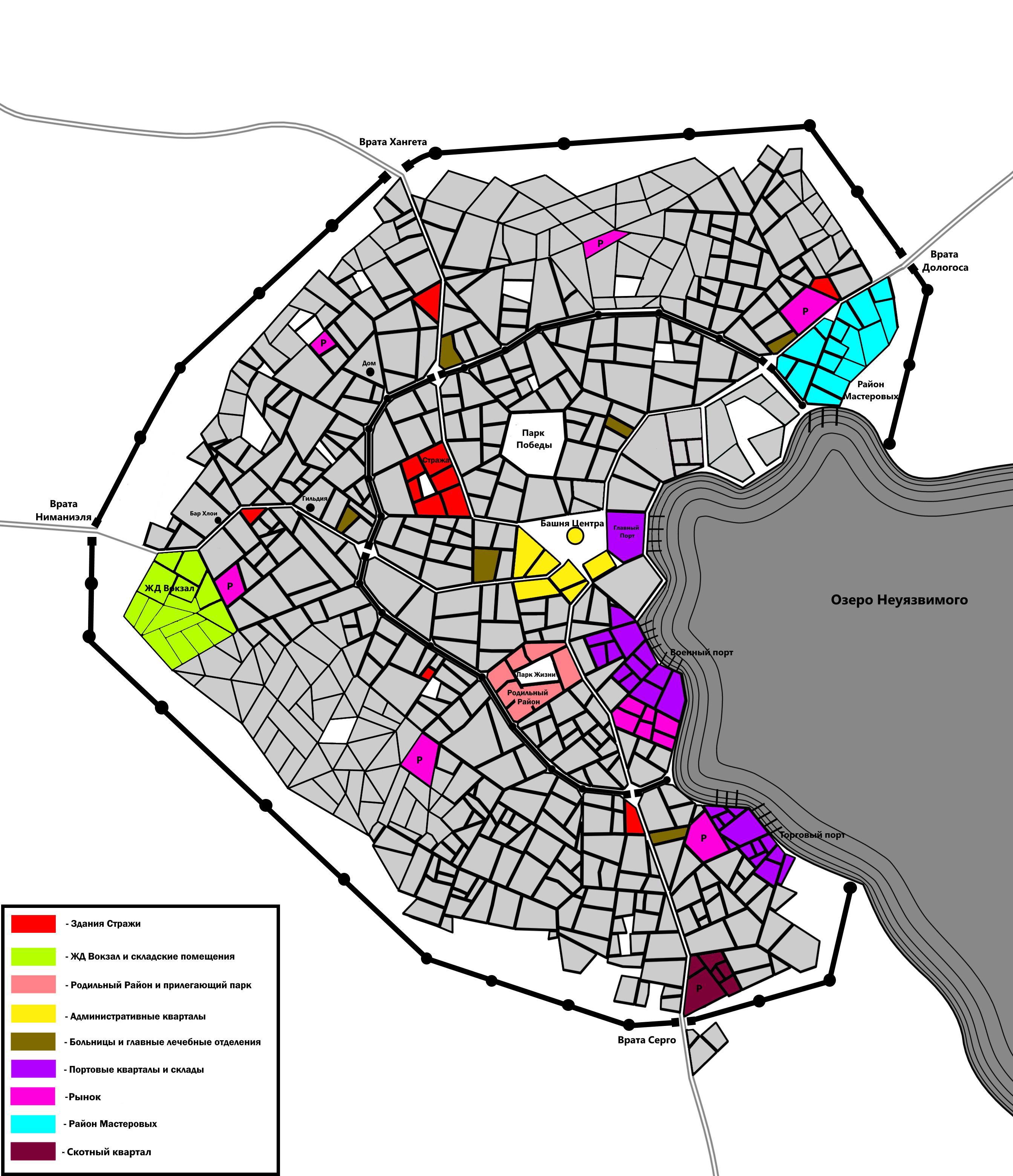 Говорю сразу, карта довольно упрощенная и реальных размеров не показывает. Ну и некоторые места намного больше чем может показаться. Тот же район стражи - это целая внутренняя укрепленная крепость.