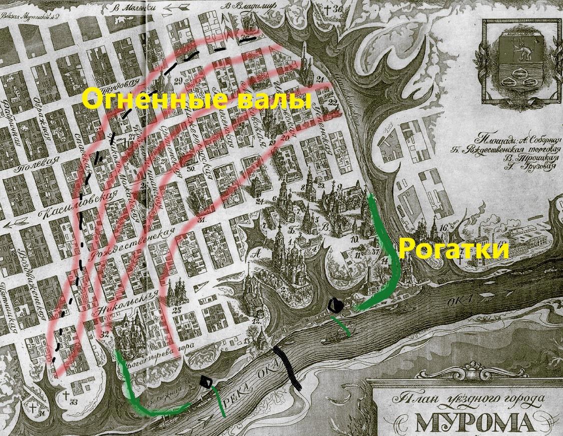 Далее. Двое суток гвардия Орлова концентрировала силы. Готовился и Муром. Силами крестьян, пленных и солдат полка было создано несколько линий обороны. Каждая линия представляла собой непрерывный вал из древесины от разобранных домов с растопкой, политые смолой и прочим горючим. За валом в 100 метрах земляной вал-бруствер для стрельбы стоя. На определенных местах редуты для орудий. В прочем в тексте все рассказано. Добавлю что под рукой у Орлова есть: полные - Преображенский (68 офицеров и 2800 рядовых), Измайловский (62 офицера 2000 рядовых), и Конный лейб-гвардии полки (1400 чел), плюс к этому батальон (500 чел) Ингерманландского полка куда включили остатки Семеновского (500 чел) (поскольку тот потерял флаг и перестал существовать) + 1200 гусар и карабинеров Санкт— Петербургского легиона
