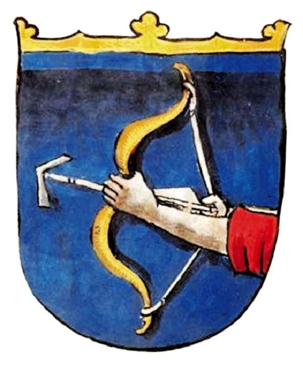 Правда, нигде и никогда не упоминалось, что этот ангел – именно Михаил, да и изображение было не сильно распространено. Гораздо чаще в качестве герба Киева выступала так называемая «куша» - изображение рук с луком или самострелом. Вот, например, изображение герба Киева из Гербовника Конрада Грюненберга (1480 год).