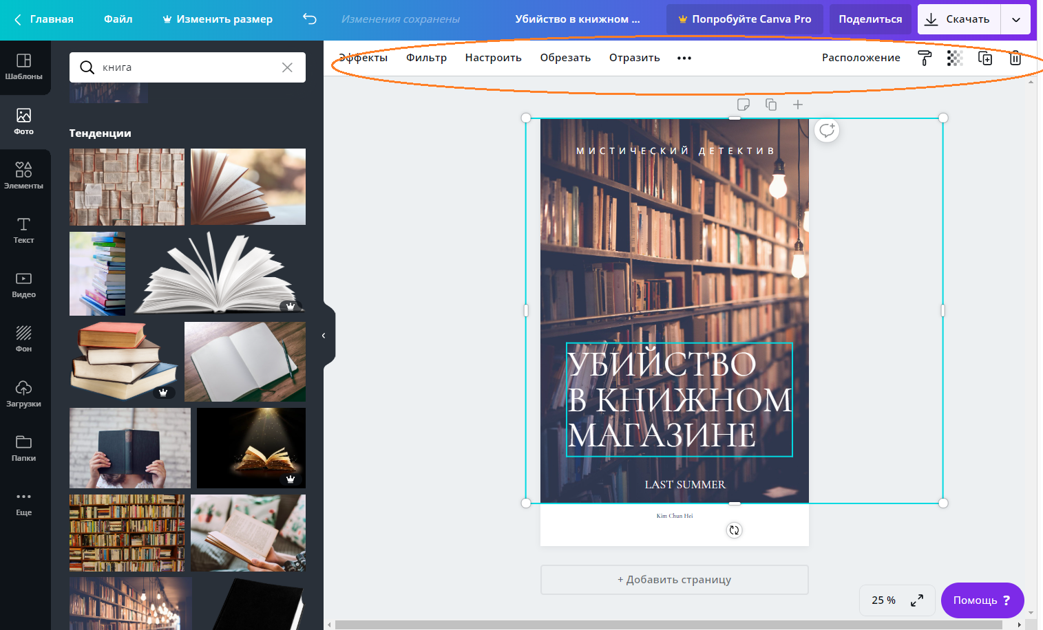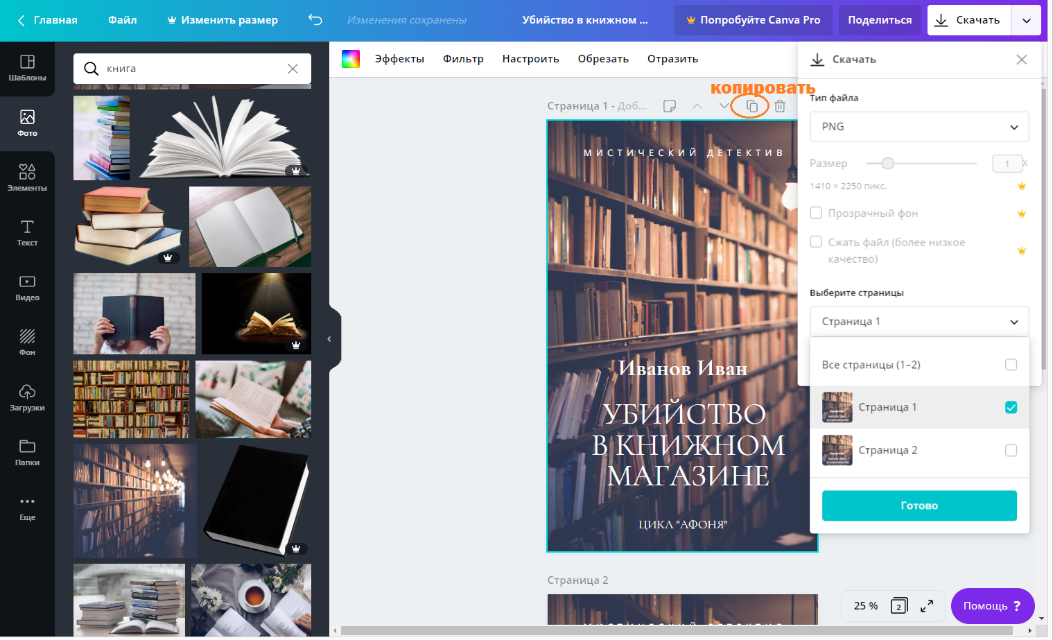 Если увлеклись и хотите сделать разные варианты обложки, а потом выбрать, то можно сделать просто копию готовой (на фото оранжевым отмечена кнопочка) - ниже появится клон готовой страницы, там можно менять что-то еще, и так наплодить кучу вариантов обложки с разными шрифтами/размерами/компоновками и тд.