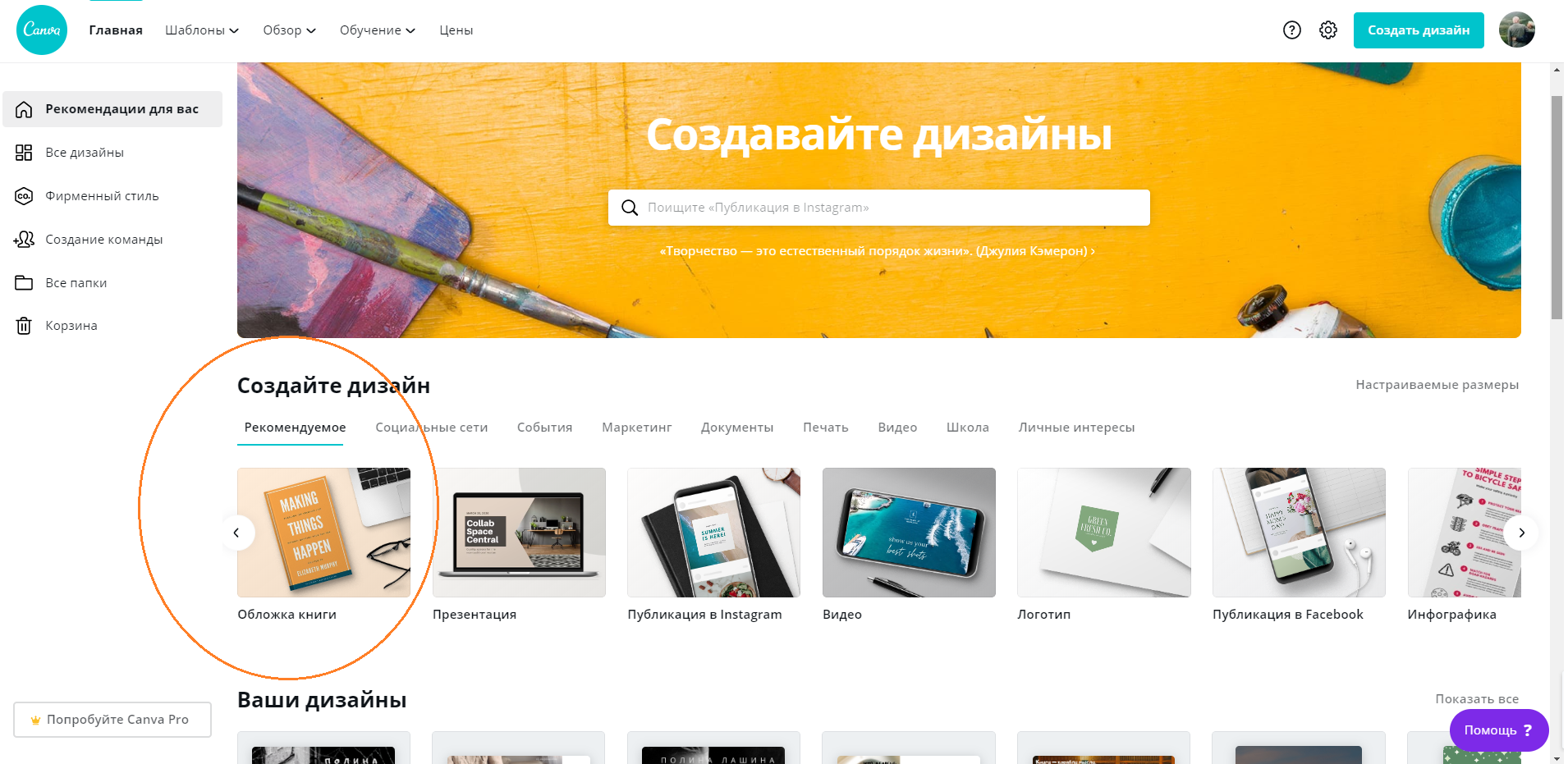 Сайт Canva.com - может уже слышали. Есть премиум-аккаунт, но для обложки пойдет и бесплатный вход. Отличный он-лайн редактор с отличным функционалом и большим количеством уже готовых шаблонов и фото-коллекцией. Смотрите, есть даже раздел шаблонов "Обложка книги"