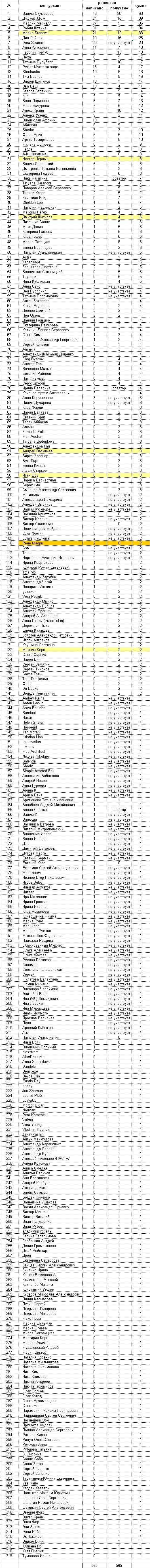 P.S. Жёлтым цветом отмечены авторы, снявшие свои произведения с конкурса, но чьи рецензенты при этом не пострадали. Чуть потемнее цвет у Рене Маори (см. выше).