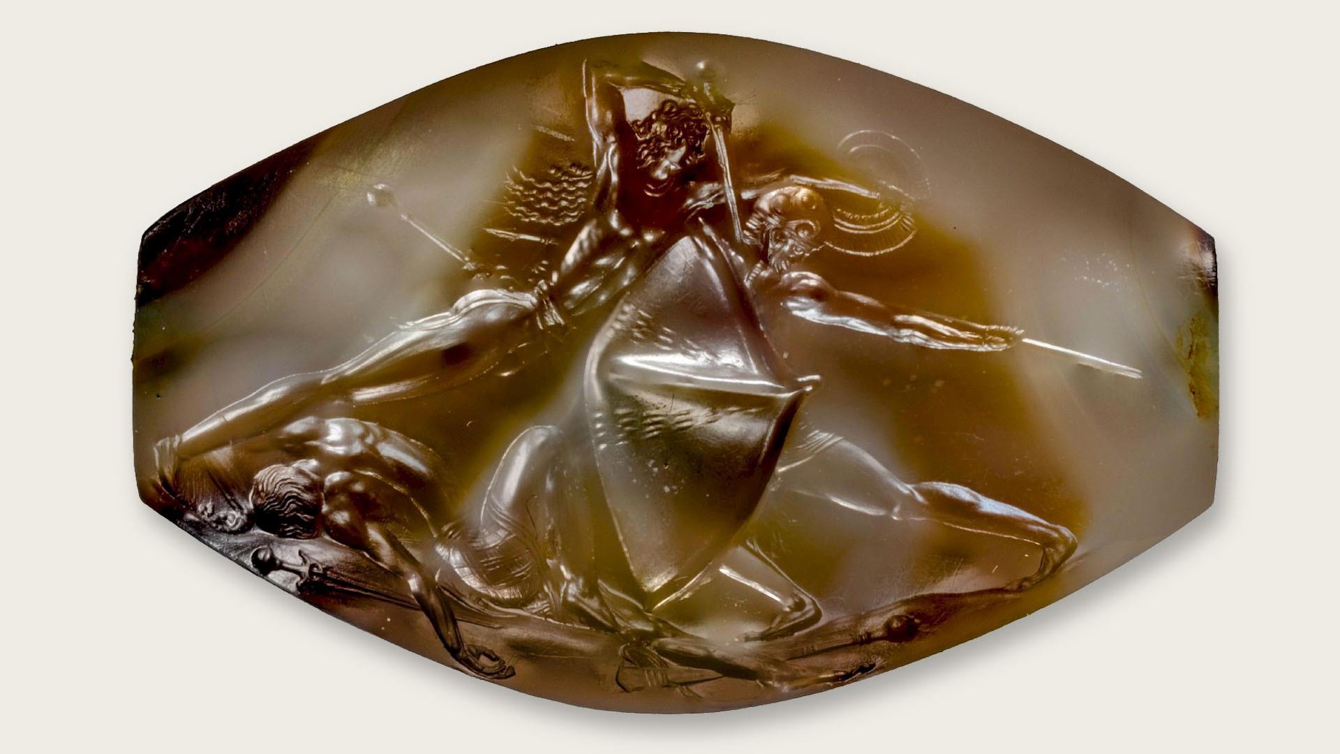 Новое открытие, недавно сделанное учёными, поразило исследователей филигранной техникой исполнения. Очищенный от известняка артефакт представляет собой печать из агата, на которой изображена сцена битвы воинов. По словам исследователей, это одно из самых замечательных открытий за последние пол столетия на территории Греции.
