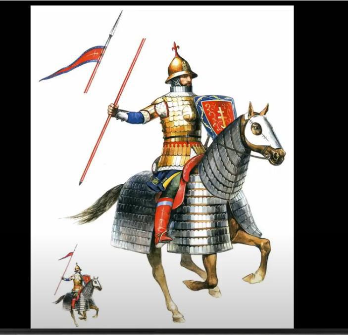 Россия, или тогда еще разные княжества. В течение почти двух сотен с лишним лет, начиная от вторжения монголов и до самого Куликового побоища, русский воин был примерно одинаков. Это профессиональный военный, на мощном крупном коне, защищённый кольчугой или панцирем, в шлеме, со щитом и длинным копьём. Высокая лука седла позволяла как следует упереться для мощного таранного удара, а длинные шпоры помогали управлять лощадью при посадке с вытянутыми ногами. Другими словами, это тот же рыцарь, по европейски вооружённый и ничем в целом от них не отличающийся. Вот такой примерно.