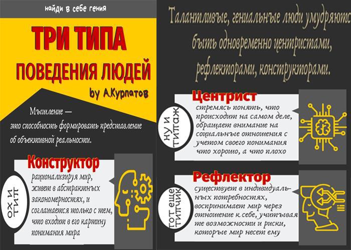 Можно поспорить с Курпатовым. Кстати, он и не настаивает, что все эти типы не перемешиваются, и в один день вы не можете побыть и рефлектором, и центристом. Но есть и некое преобладание.