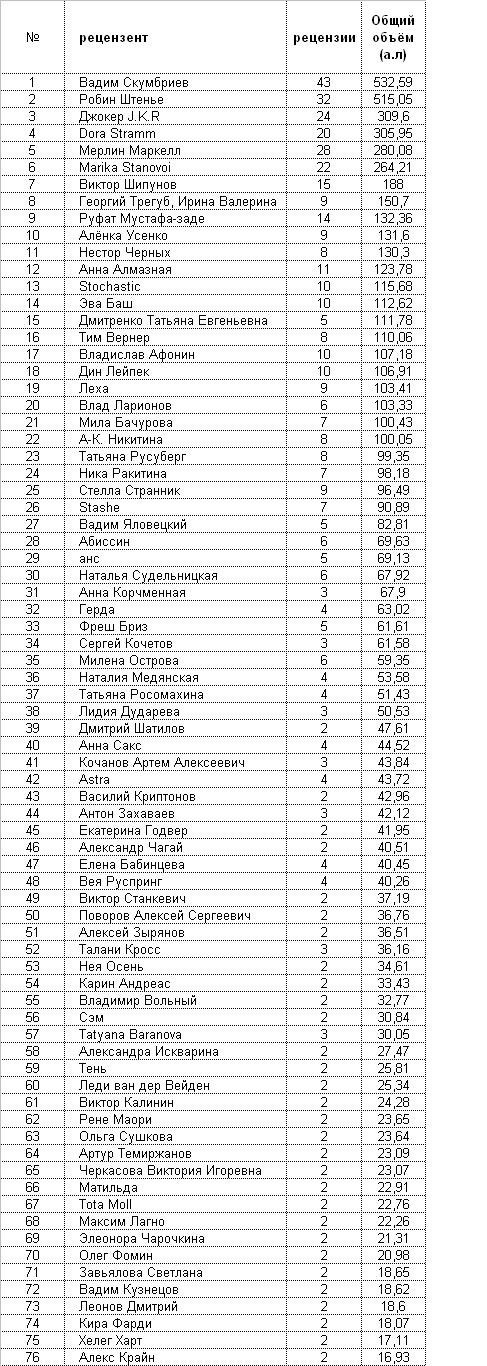 P.S. В таблице представлены рецензенты написавшие более одной рецензии (77 человек), 97 участников конкурса написали только одну рецензию.