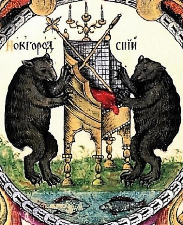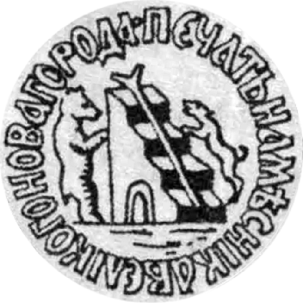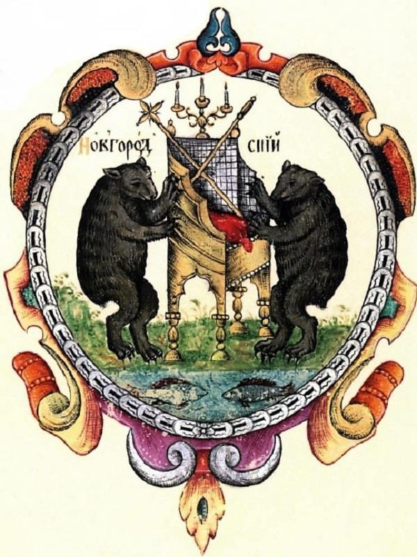 В старой летописи сохранилось и описание этой печати – дескать, Грозный-царь велел вырезать Новгороду новую печать, а на печати «место, а на месте посох, а у места с сторону медведь, а с другую сторону рысь, а под местом рыба». Точно так же выглядит герб Новгорода и на Большой печати Ивана Грозного с гербами русских земель: