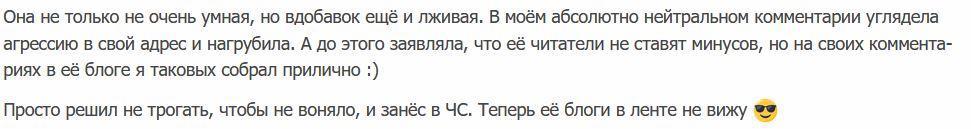 Я часто пишу блоги с не очень популярным мнением (плюсов на них, если вы не видите, не так и много, значит, мнение не популярно), зато людей цепляющие, с кучей комментариев. И тут начинается картина маслом: приходят ко мне в блоги люди, пишут провокационные комментарии, обычно расходящиеся с мнением большинства в теме, и ожидаемо получают за них минусы. При этом не от меня, забавно (я редко ставлю минусы своим гостям). От меня получают комментарии, которые им редко нравятся. И что же происходит потом? Ну человек либо уходит из темы, либо начинает с остервенением минусить в ответ хозяина темы (меня) и… даже нейтральные комментарии гостей этой же темы… и не выдержав вчера подобной ситуации (я не сильно люблю, когда обижают моих вежливых и спокойных гостей, простите) я отправила такого человека в ЧС. Да, временами вычислить, кто у нас такой герой, не так и сложно.