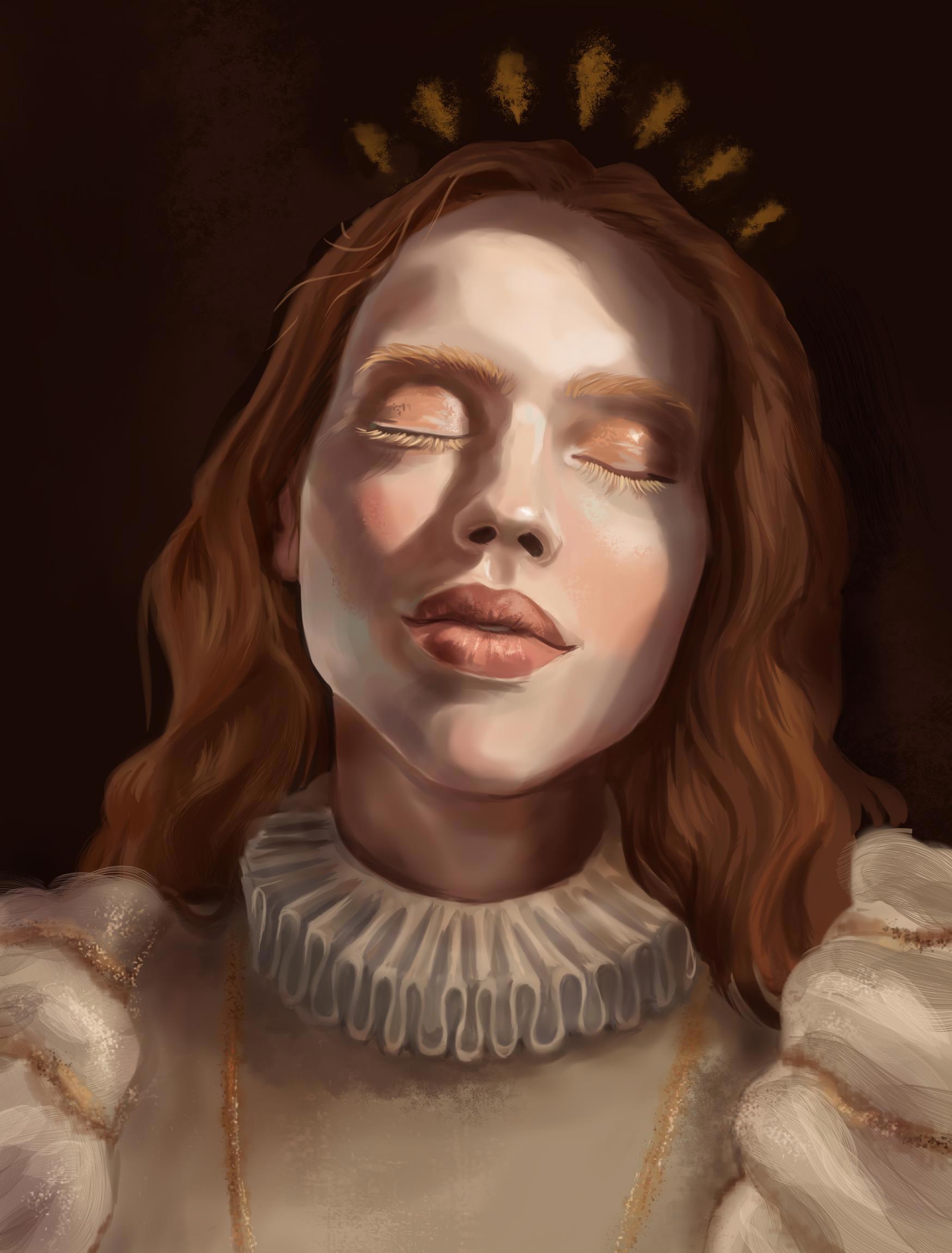 На оригинальном фото модель одета в обычный свитер. Но прекрасная внешность девушки и таинственное освещение референса унесли меня в историческию и ассоциации с известными европейскими династиями.