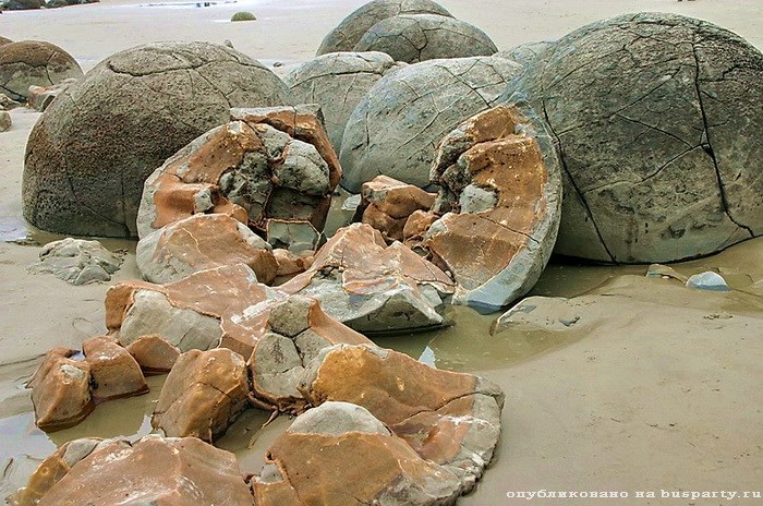 А ещё некоторые шары просто "разбиваются" на части. Ровно или не очень. И вот люди внутри видят что-то действительно похожее на строение яйца - есть "скорлупа", есть "белок" и есть сердцевина - "желток". И как это понимать? Может быть на самом деле существовали какие-то сверхкрупные монстры, отложившие миллионы лет такие вот "яички"? Или это просто результат послойного формирования не совсем обычной геологической структуры?