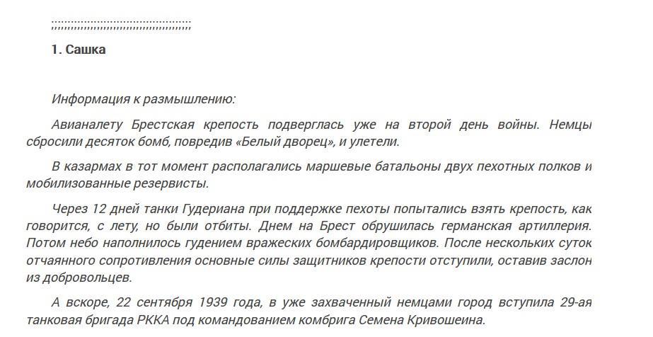 Далее идет «Информация к размышлению», как в фильме «Семнадцать мгновений весны», а еще в мультфильме «Остров сокровищ». Опять заимствование. Умышленное? Если честно, такая компиляция меня начала напрягать. Тут нет никакого намека на юмор, тема войны серьезная и больная, плагиатить название фильма, потом прием из другого фильма – это не пример постмодерна и не симулякр, не пример подачи исторического материала. Выглядит не слишком этично с моей точки зрения. Остальные читатели могут не согласиться, их право.