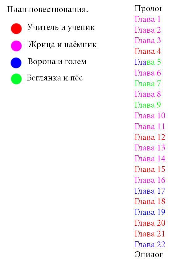 После испрашивания совета у читателей касаемо компоновки глав, пришёл к нижеследующему варианту, который меня устроил. Четыре сюжетные линии: