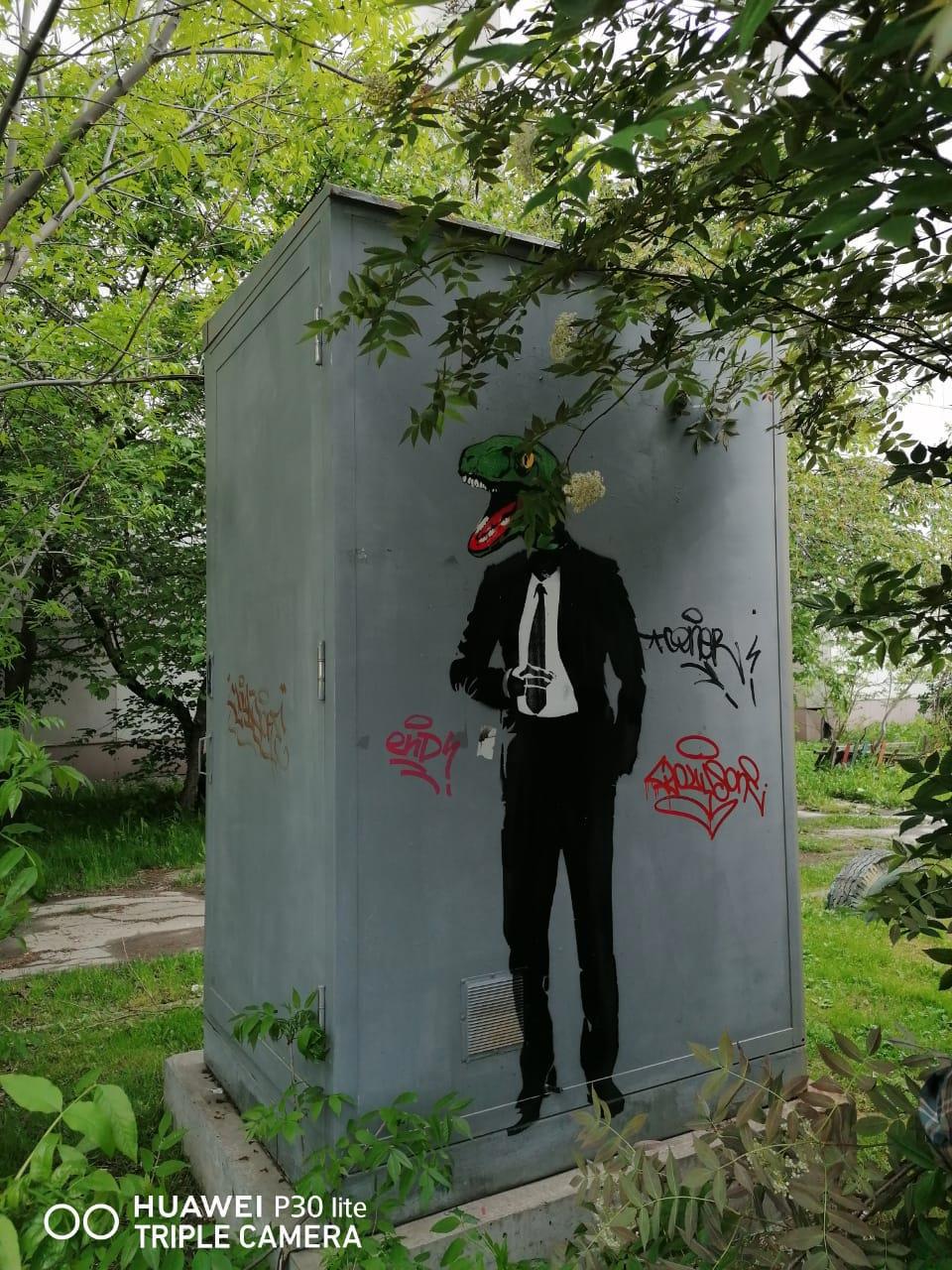 Точно уже не помню, но следующее граффити появилось по-моему в одно время с артистом, может чуть позже. Оно немного запрятано, на трансформаторной будке. Зимой и весной классно смотрится! Ящер в костюме среди снегов! Летом "зеленый" прячется за деревьями и кустами)