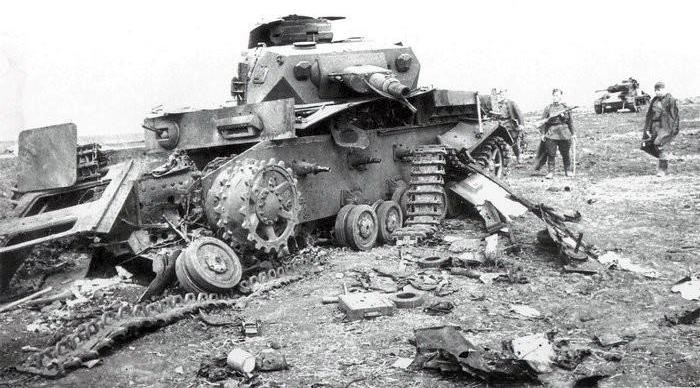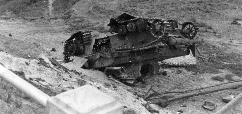 Вот и немцы. Дистанция сокращается. Осталось 500 метров. Раздалась команда "ПЛИ!" Поле боя заволокло дымом, но у немцев дела были куда хуже. Тяжёлые снаряды срывали у танков башни, проламывали тяжёлую лобовую броню. Даже если 45-килограммовый снаряд взрывался рядом, то танки просто переворачивались. В общем это выглядело как-то так: