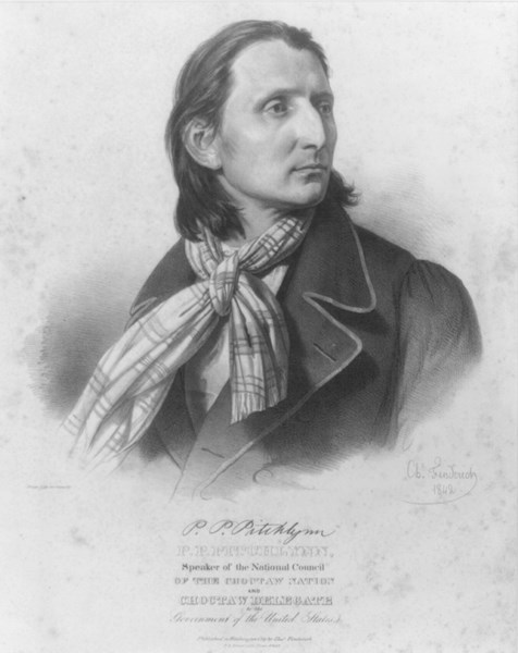 Края, куда он возвращался, не были для него родными. Он переехал на Индийскую территорию в 1830-хс территории нынешнего штата Миссисипи. Сам Питчлинн был индейцем только на четверть: его мать была София Фолсом, дочь знатной индианки и белого торговца, отцом был майор Джон Питчлинн, белый, воспитанный после смерти родителей среди чокто. Вспоминаем закон наследования: Hat-choo-tuck-nee ("The Snapping Turtle"), он же Питер Перкинс Питчлинн по праву получил высокое положение. Можно даже предположить, что он получил традиционное индейское воспитание, но с этим плохо сочетается тот факт, что он учился в университете Нэшвилла, штат Теннесси. Благодаря своему образованию он и проводил много времени в Вашингтоне, представляя там народ чокто. Сыновей его звали Ликург, Леонидас и Питер-младший. Были ли у них индейские имена, Автору дознаться не удалось; по сохранившимся письмам главного вождя создается впечатление, что их образ жизни скорее соответствовал образу жизни белых плантаторов. Ну, с добавлением некоторого национального колорита.