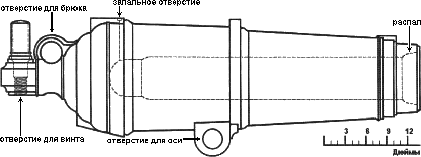 • запальное отверстие - приводит в камору, которая у каронады всегда меньше калибра ствола