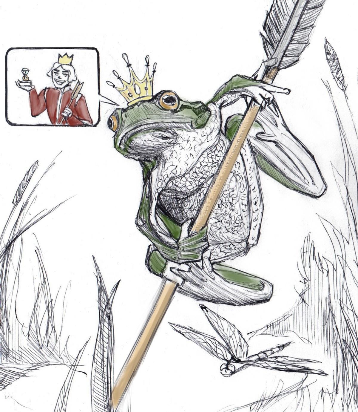 В 2018 году впервые одолела хотя бы пол месяца чернильного октября. Рисунок на тему "Frog". Изначально на референсе лягушка висела на чем-то травянистоподобном, фон отсутствовал. А в результате получилась замечтавшаяся болотная принцесса