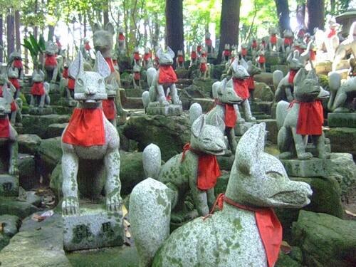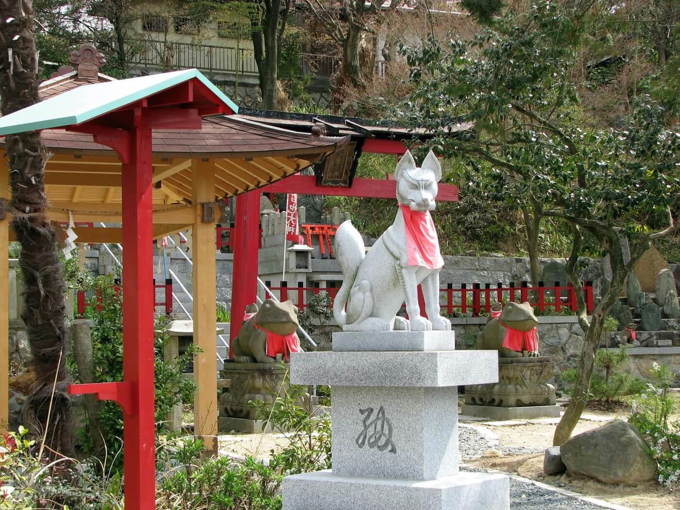 На дорожках храмового комплекса также расположено множество скульптурных изображений священной лисицы кицунэ, обязательно размещаемых в святилищах богини Инари. Часто кицунэ украшены красными ёдарэкакэ (нагрудниками), приносимыми в знак почитания.