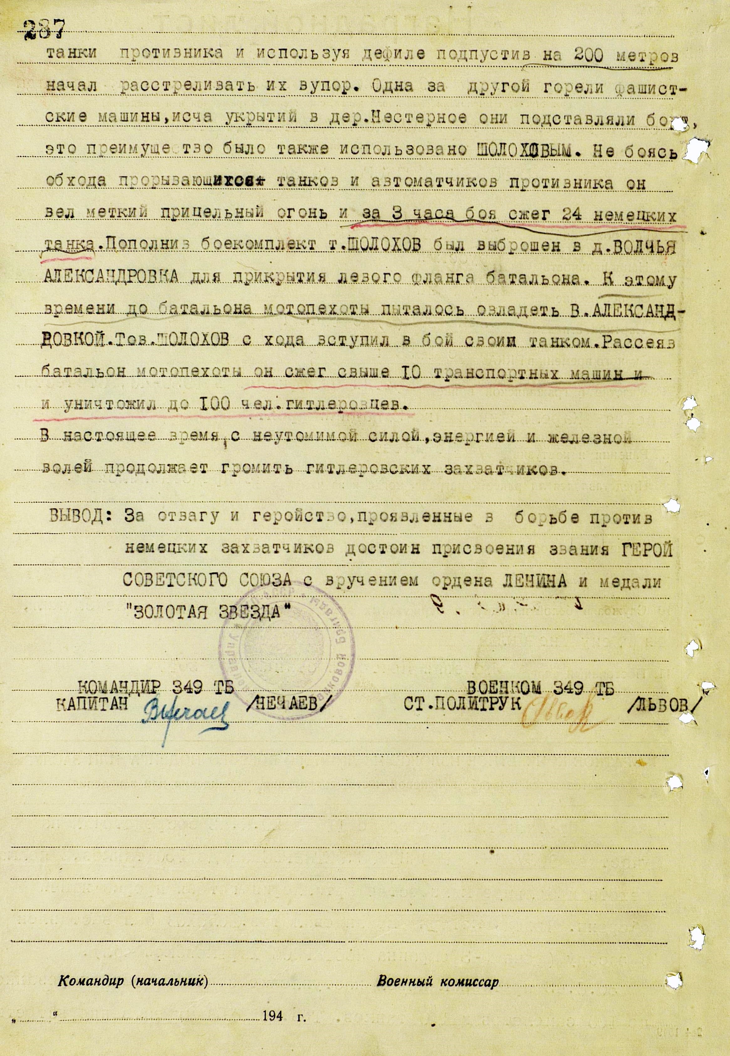Нужно ещё отметить, что взводу Шолохова было значительно труднее, чем Колобанову под Ленинградом в 1941 году. После боя на танке Колобанова насчитали до 150 попаданий… Броню пробить не удалось. Теперь же, к 42-му году, немцы приняли срочные меры. Уже ушли к этому времени в небытие лёгкие Т-1 и Т-2. На свои PzKpfw III и PzKpfw IV немцы установили длинноствольные противотанковые орудия. Им уже поступили на вооружение кумулятивные боеприпасы. То есть любое удачное попадание означало для наших танкистов смерть.