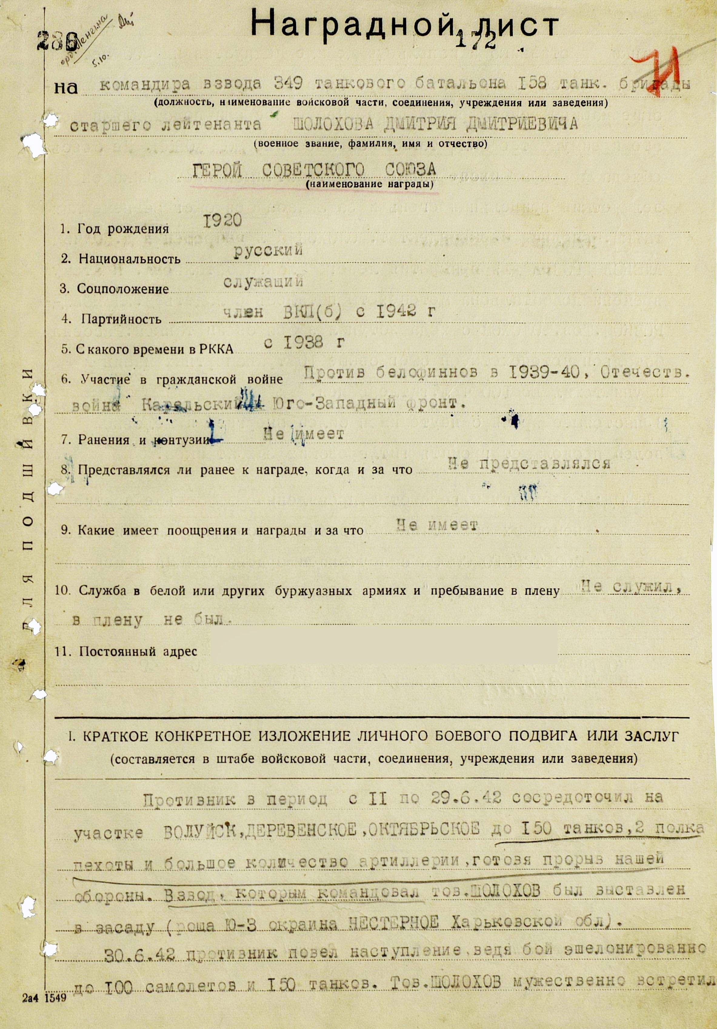 Есть ещё фотография Дмитрия Шолохова, где он позирует на фоне танка Т-34-76, но она была сделана уже в 1943 году, а из книги Егорова мы узнаём, что «В конце августа 1942 года 1-я танковая бригада № 158 прекратила своё существование, так как поставленная перед ней задача была выполнена. … в результате последних боёв в излучине Дона почти все танки бригады были уничтожены. Остались только 3 боевые машины, которые были затоплены в Дону, чтобы не достались противнику. Сама бригада переправилась под бомбовыми обстрелами через Дон (осталось человек 60-65) в Ерзовку, а затем в Саратов на переформирование». Так это всё или иначе было, сейчас понять достаточно сложно, поэтому – вернёмся к самому событию.
