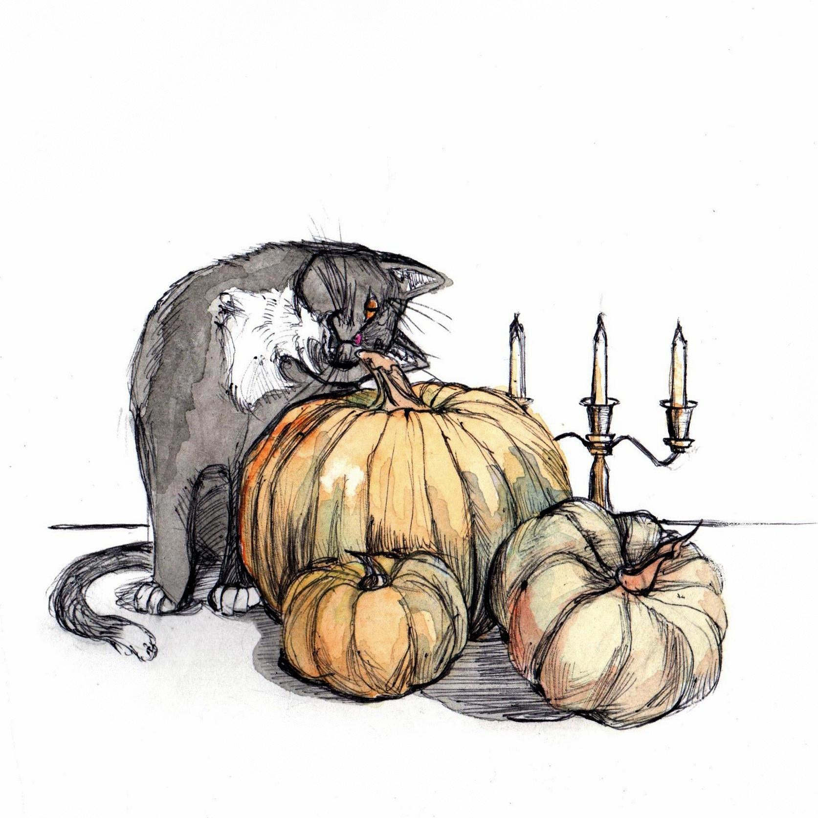 Рисунок на чернильный октябрь 2018 года. Тема "Pumpkin". И любопытный кот бонусом. Акварель и шариковая ручка.