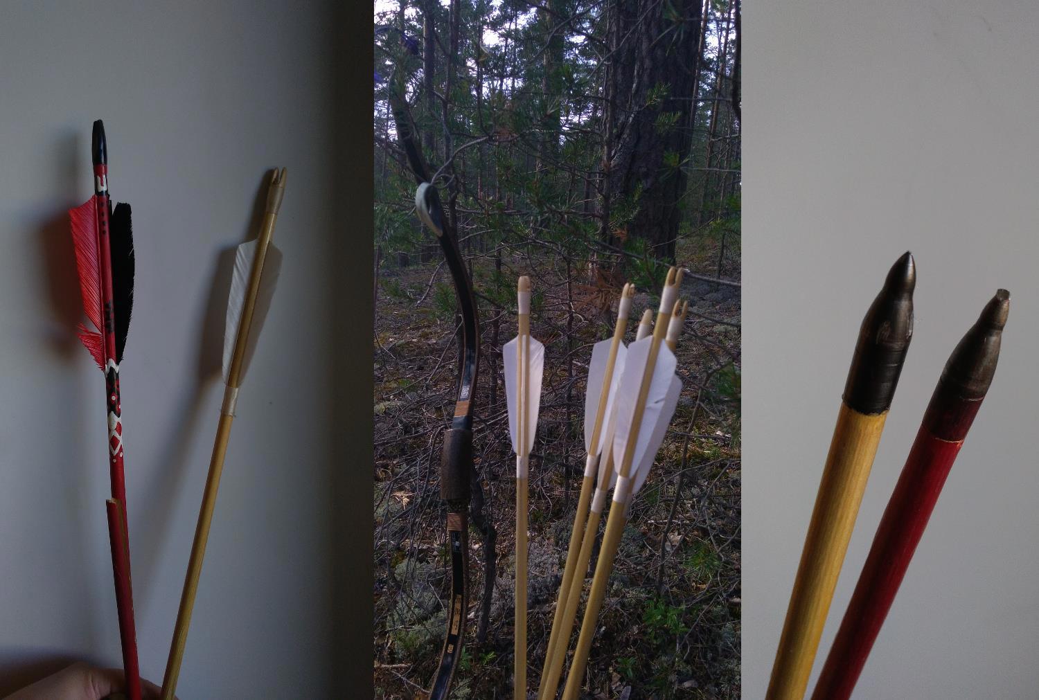 Стрелы. Красная из тренировочного почти убитого комплекта шестилетней давности собственноручной склейки и покраски. Из 12 осталось 5, остальные сломаны или потеряны. Специально сфоткала излом и затупившийся наконечник.